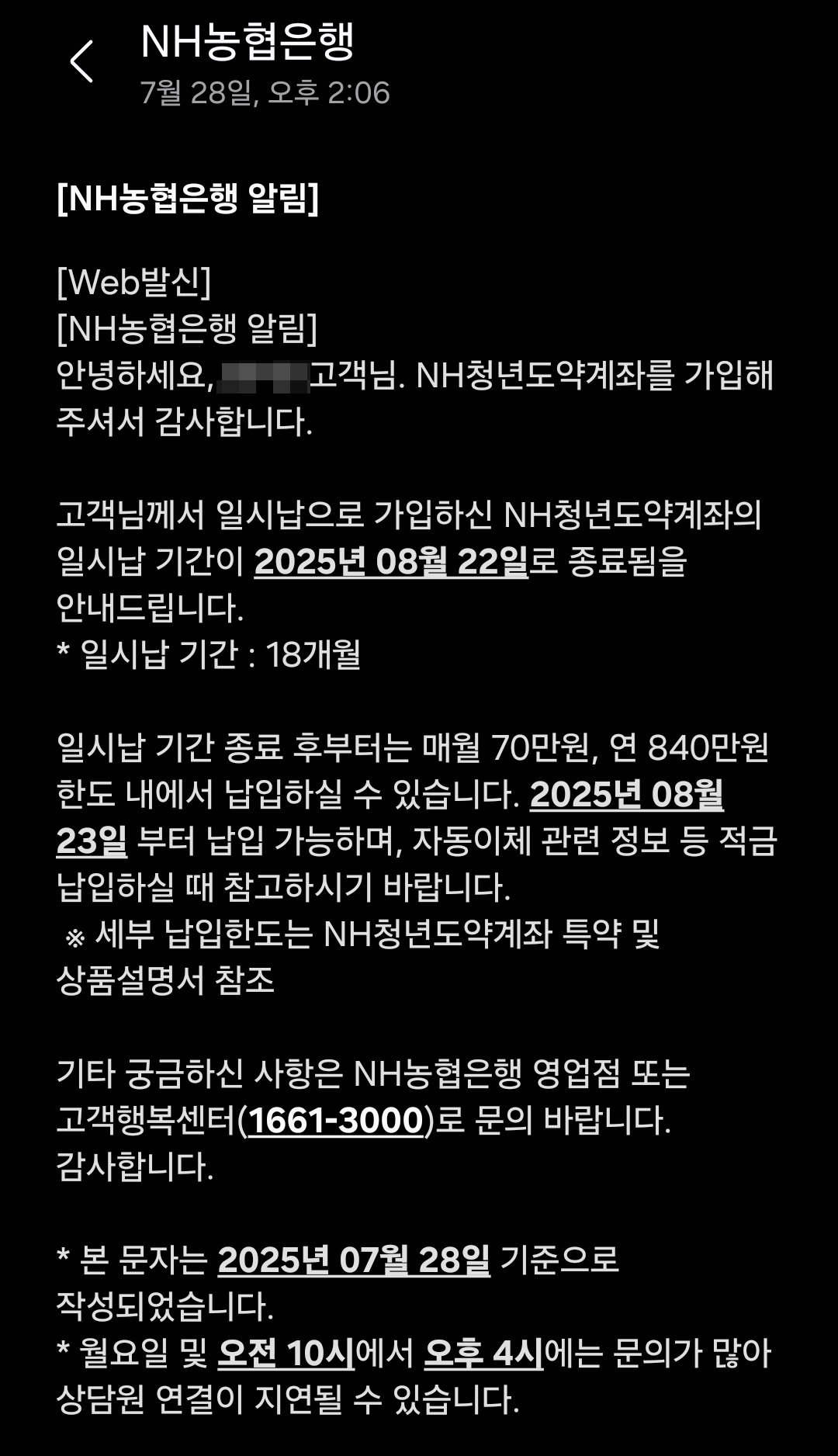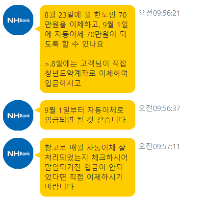 나의 경우 8월 23일부터 납입이 다시 시작이 되는데 이때 8월분의 이체를 어떻게 해야하는지와 이걸 인정해줄건지에 대한 문의였다. 결과적으로 이렇게 할 수 있다는 답변을 받았다. 하는 방법은 조금 신경을 써야한다. 현재 자동이체는 이체날짜를 매월 1일로 설정해두었기 때문에 적금 납입 시작일인 8월 23일에는 자동으로 이체되지 않는다. 이렇게되면 며칠 정도 손해를 보게 되므로, 8월 23일에는 직접 청년도약계좌 통장으로 월 한도인 70만원을 이체해주어야한다.