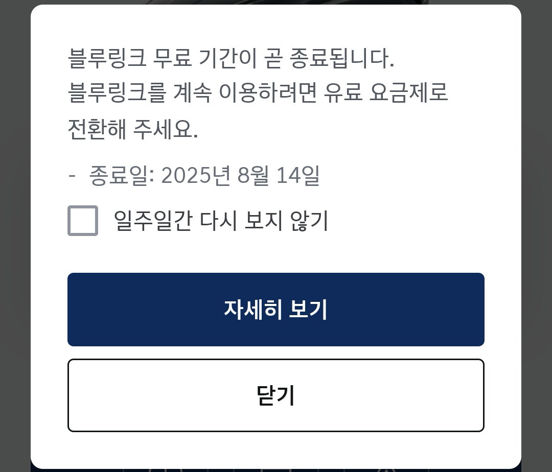 마이현대 앱을 이용하다보면 블루링크 무료기간 종료 전 약 한달 전부터, 블루링크 무료 기간이 곧 종료된다는 알림이 뜬다. 처음 차를 사게되면 5년동안 무료요금제를 적용해주고 이후부터는 유료전환되어서 유료 결제가 필요하다. 요즘에는 소프트웨어쪽은 거의 대부분 구독형이다보니까 블루링크 앱과 블루링크와 연동된 내비게이션 업데이트 등을 이용하기 위해서는 블루링크 유료 가입을 해야한다.