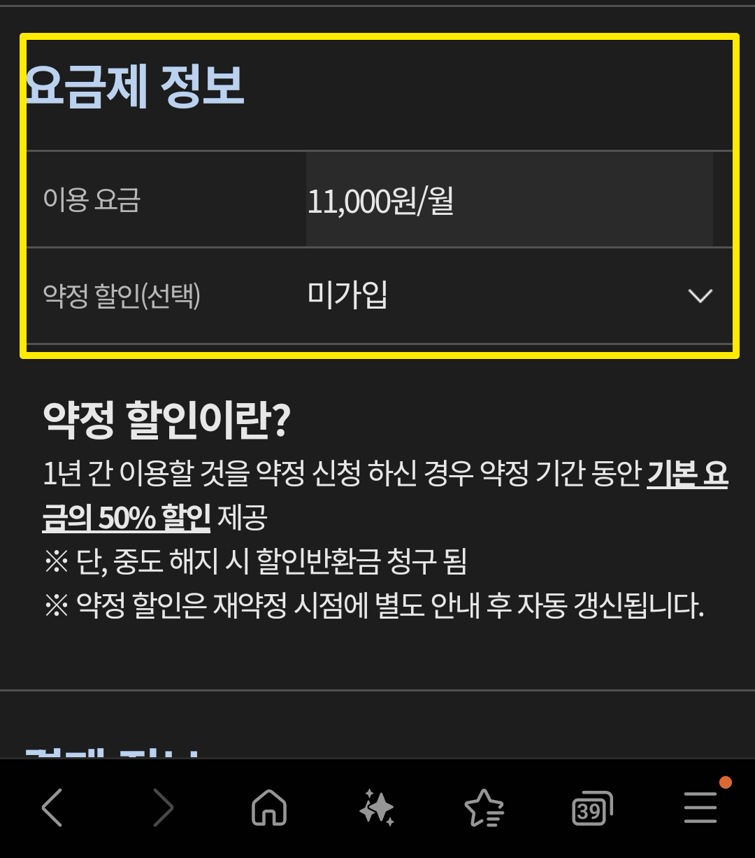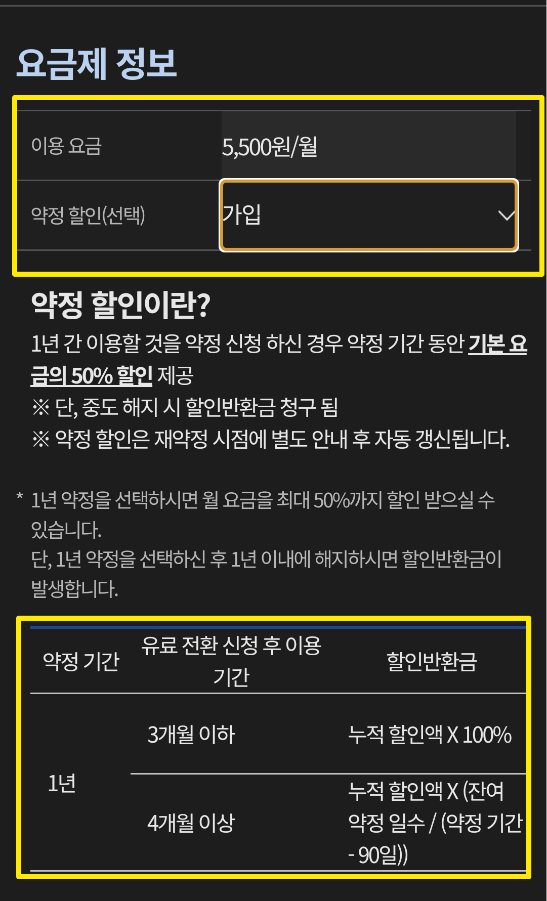 왜냐하면 나중에 약정을 해지하게 될 경우에도 지금까지 할인받았던 금액에서 할인반환금이 나가기 때문이다. 그러니까 미래에 어떻게 될지 모르는 상황에서 약정할인 가입을 안할 필요가 전혀없다. 최악의 경우라고 하더라도 할인반환금을 포함해도 매월 11,000원 금액으로 계산된다. 처음부터 약정미가입할 이유는 아예 없다.