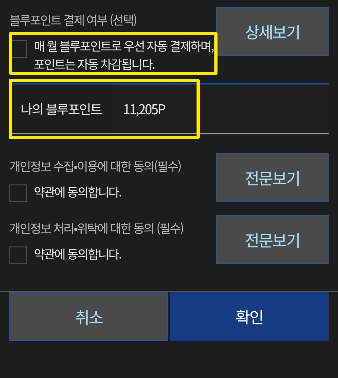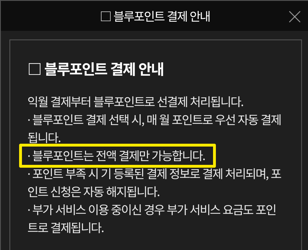 블루포인트가 있는지도 체크해보자. 나의 경우 블루포인트가 어디에서 생긴지는 모르겠는데 아무튼 11,205포인트가 있는데 이 금액으로는 두 달치 블루링크(5500*2=11000)를 쓸 수 있는 포인트다. 블루포인트 결제는 전액으로만 결제가 가능하기 때문에 5500, 11000원처럼 딱 떨어지는 금액 이상으로 있어야한다. 두 달 결제하고나면 205포인트가 남게 되는데 이건 쓸 일이 거의 없을 것 같다.