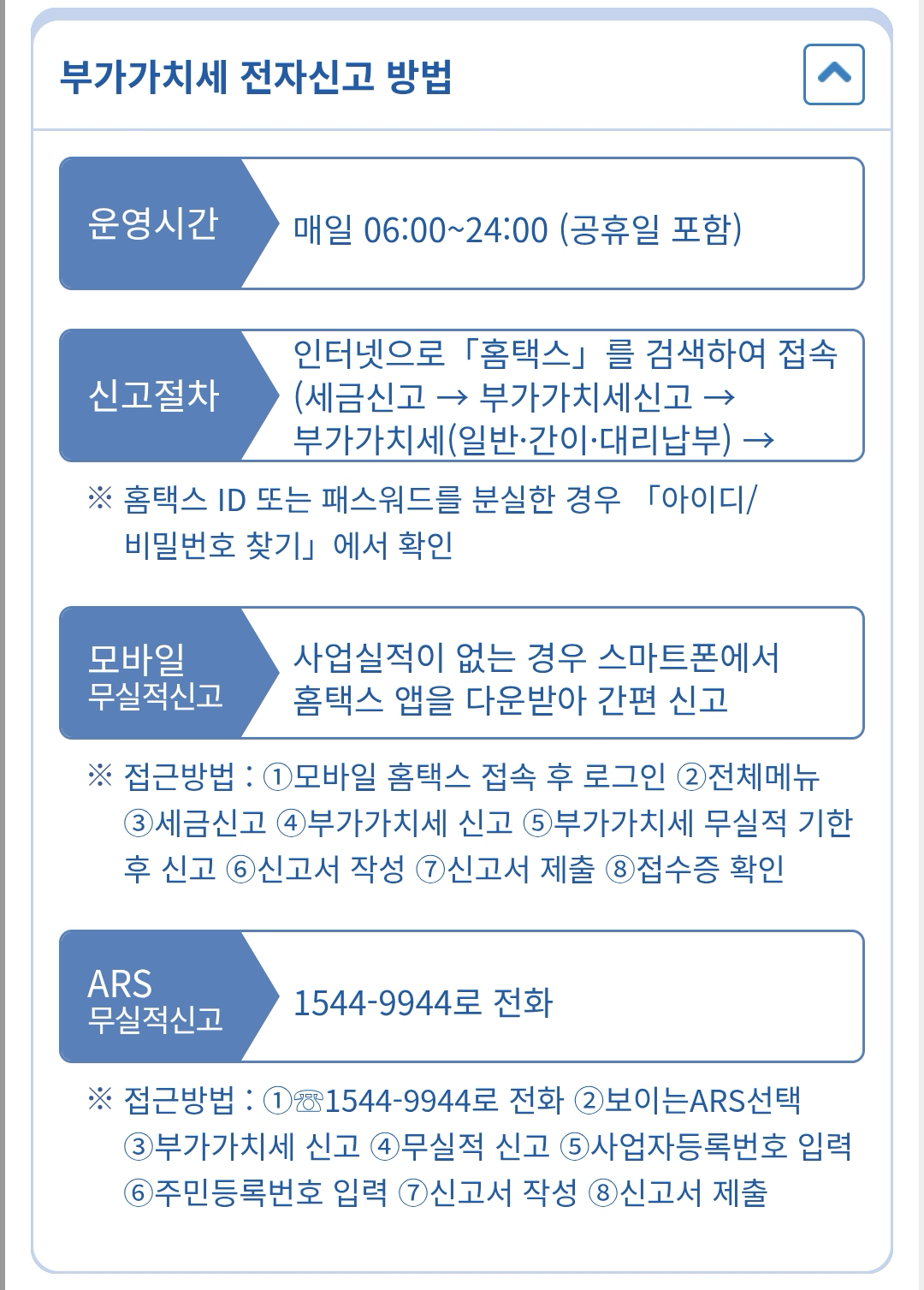 사업실적이 없어도 무실적 신고를 진행하면 된다. 보통 매출과 매입 등이 복잡하게 있는 경우가 많으므로 직접 셀프로 부가세신고를 할 경우 영수증 정규증빙 수취를 잘 해두는게 편리하다. 부가세 신고와 납부는 모두 홈택스 홈페이지에서 진행한다.