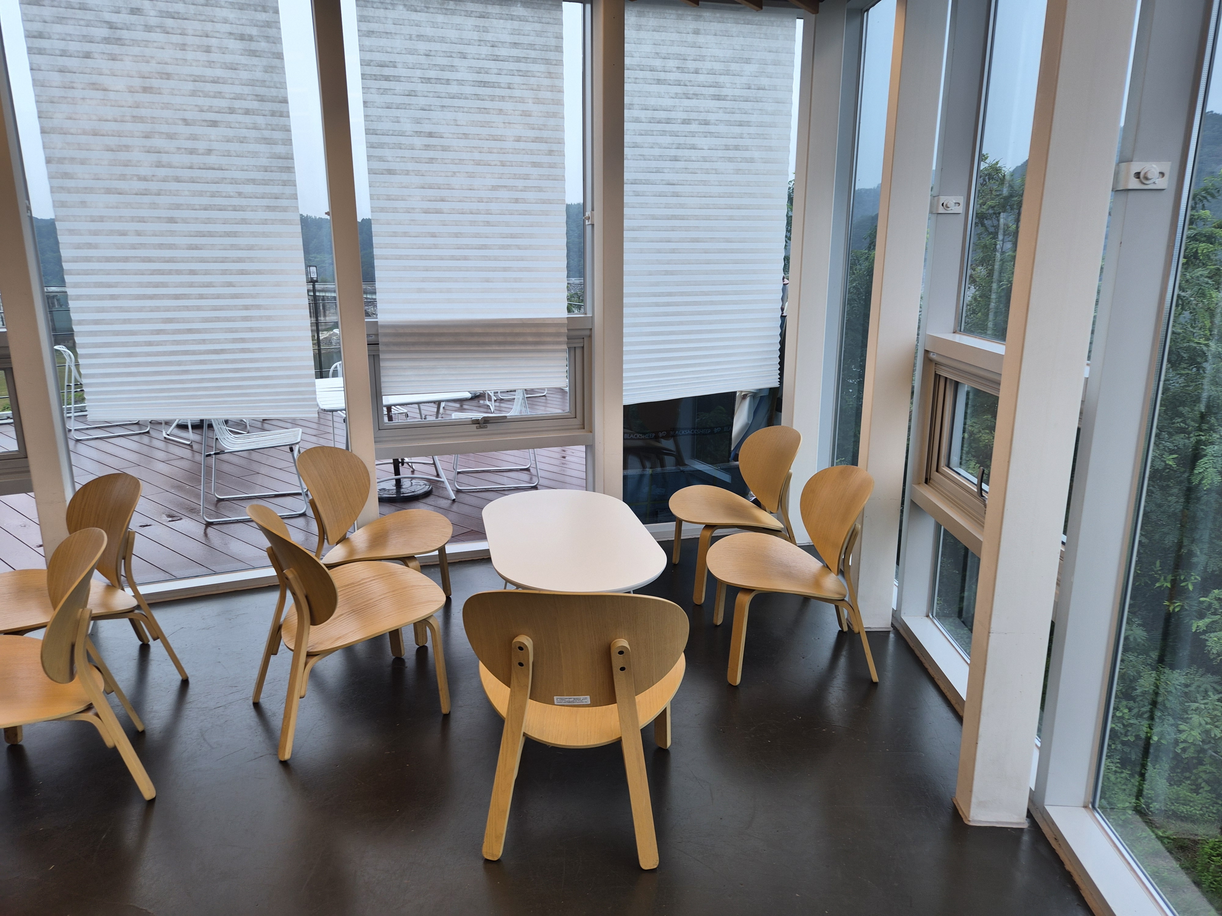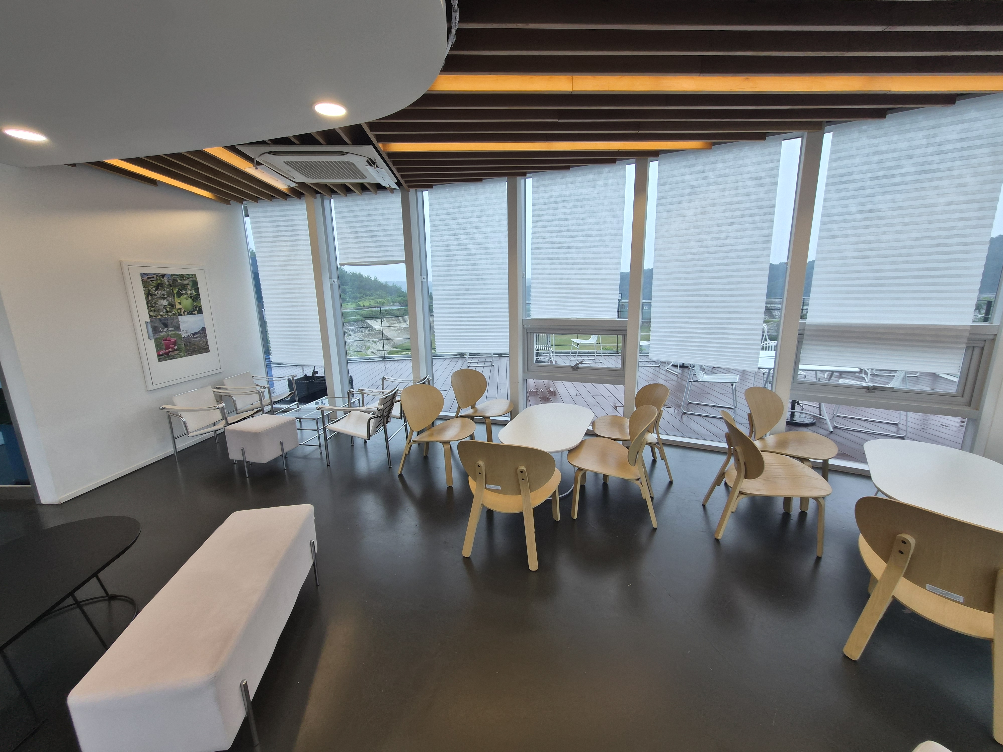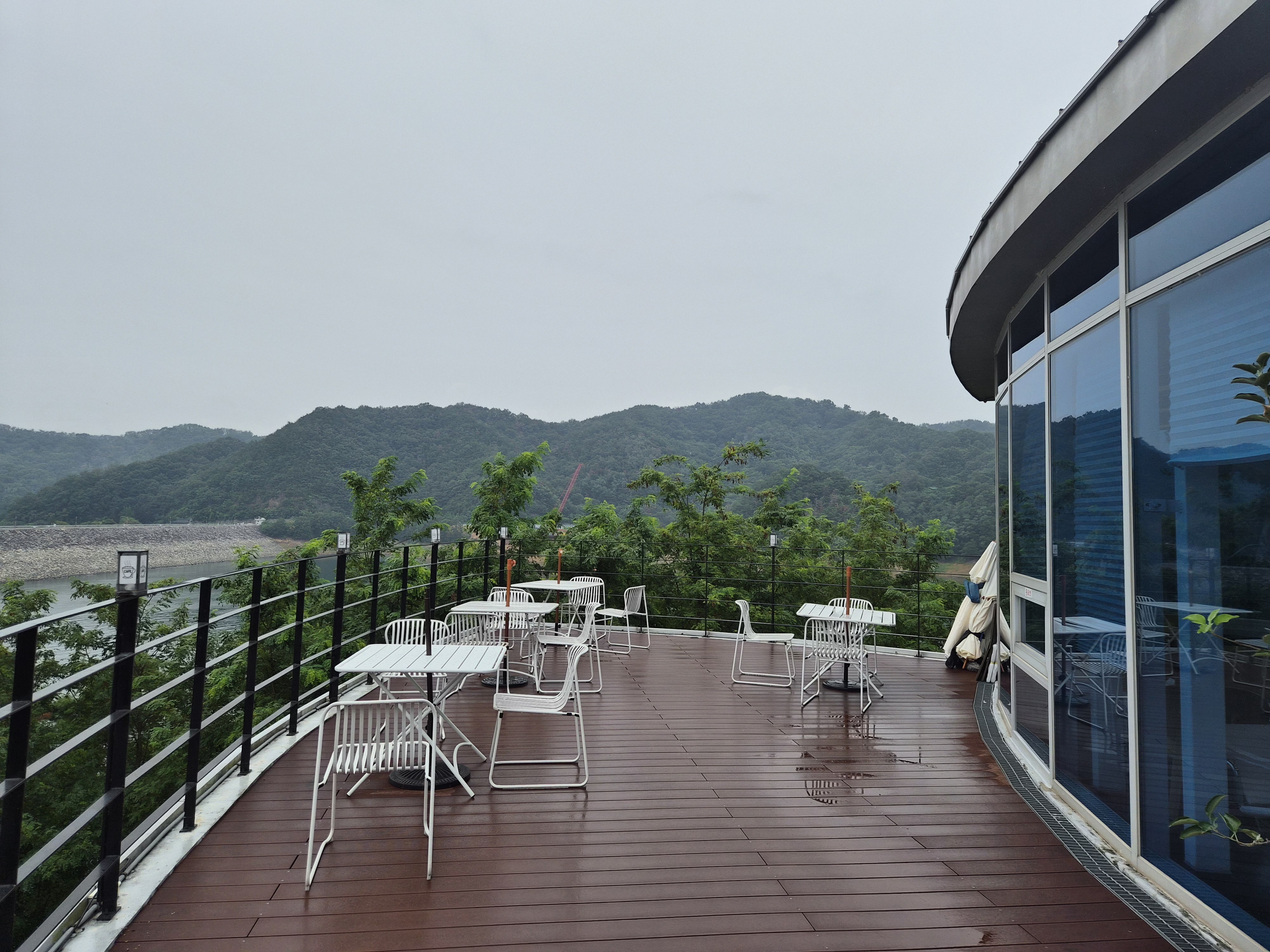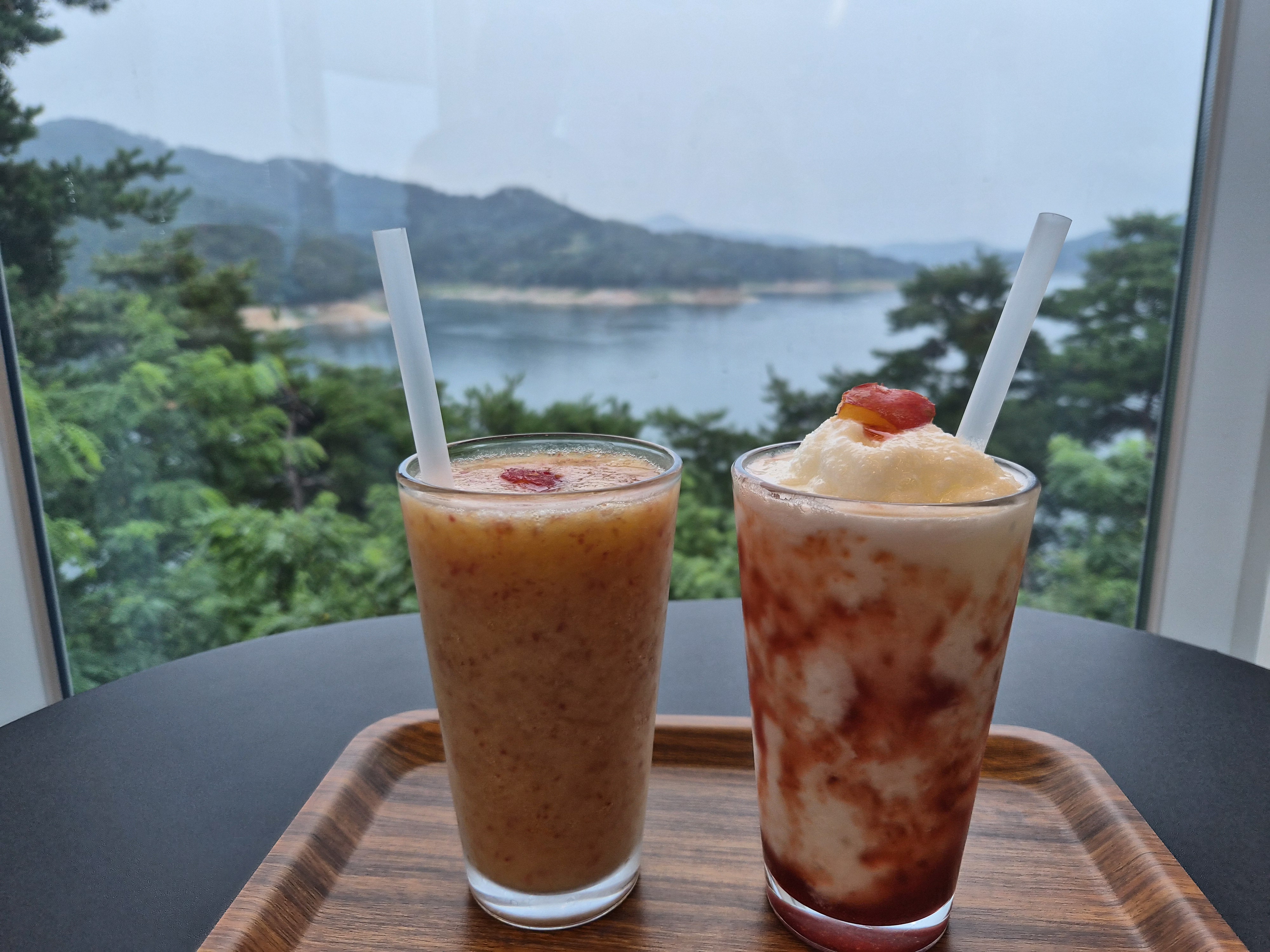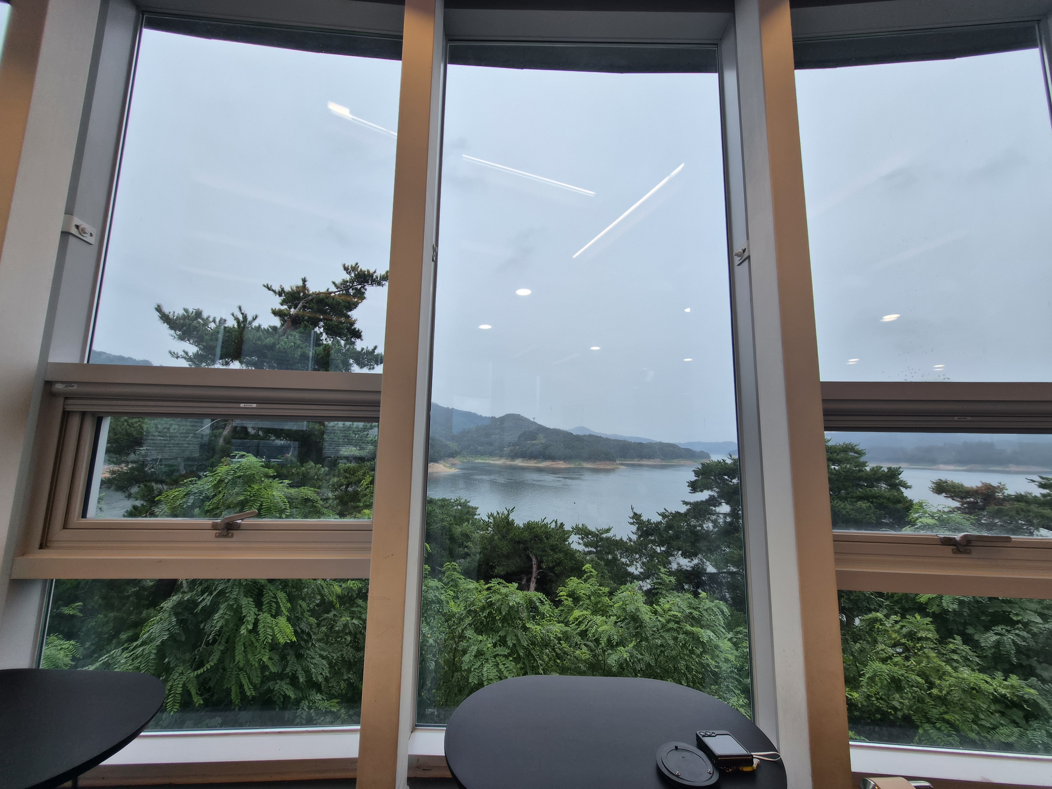 카페 내부는 창밖을 둘러보는 형식으로 구성되어 있었습니다. 아무래도 창가쪽이 안동호를 내려다보는 뷰가 나오는 곳이라서 어떤 자리에서도 창 밖 풍경을 볼 수 있었는데 예뻤어요. 애플향 카페 자체가 안동호가 한눈에 내려다보이는 전망 좋은 곳에 위치해 있다보니 아름다운 풍경을 배경으로 여유로운 시간을 보낼 수 있다는 점이 특별한 매력이었습니다. 통유리창 너머로 펼쳐지는 안동호의 풍경은 낭만을 만끽하기에 더없이 좋았어요.