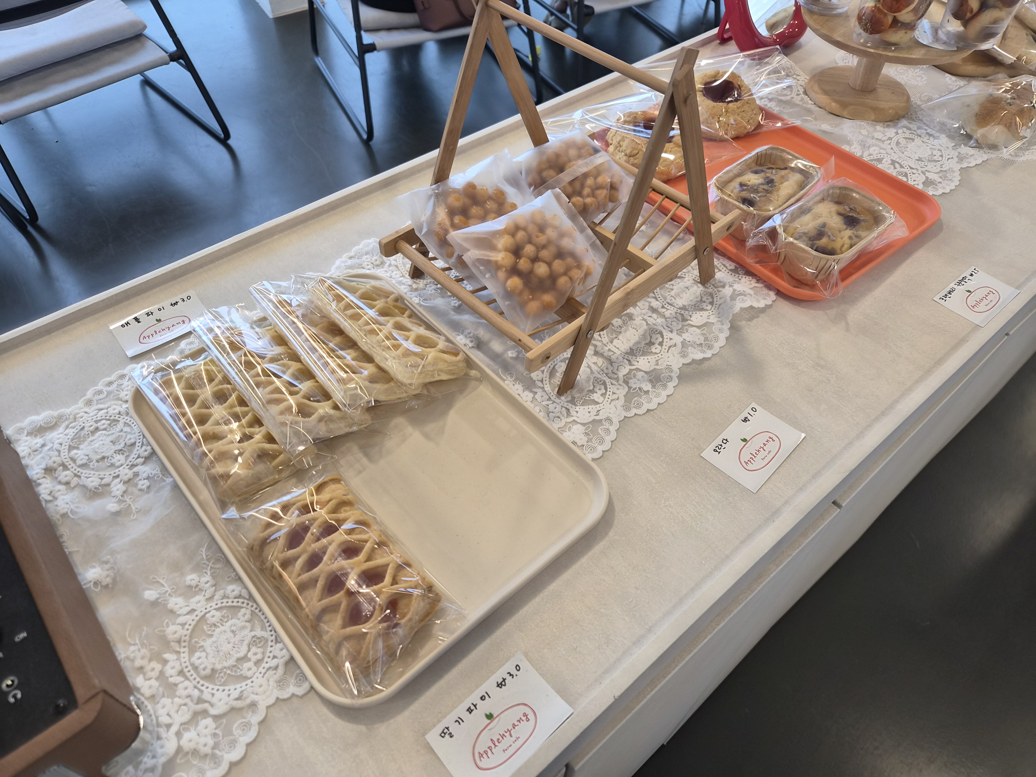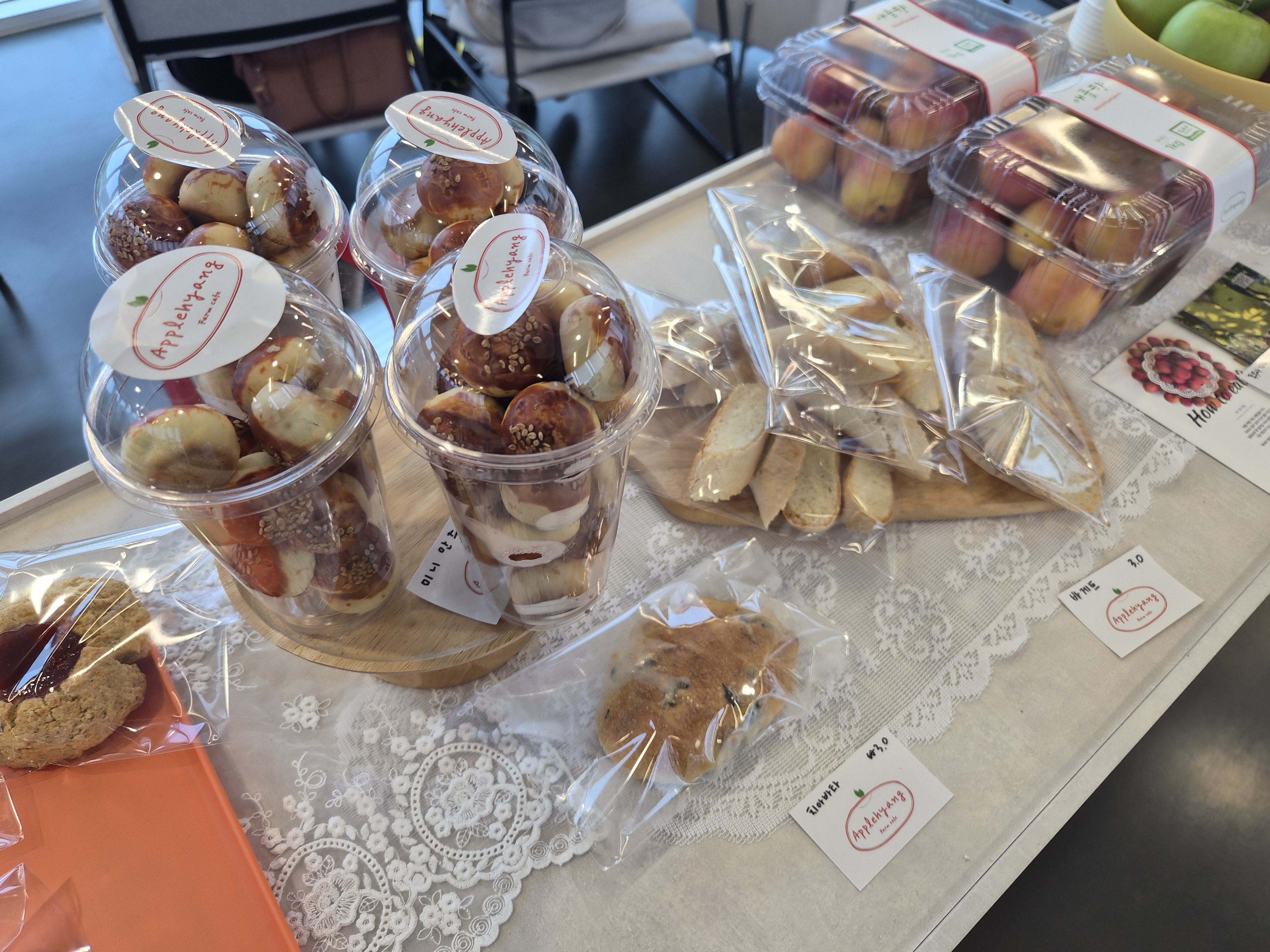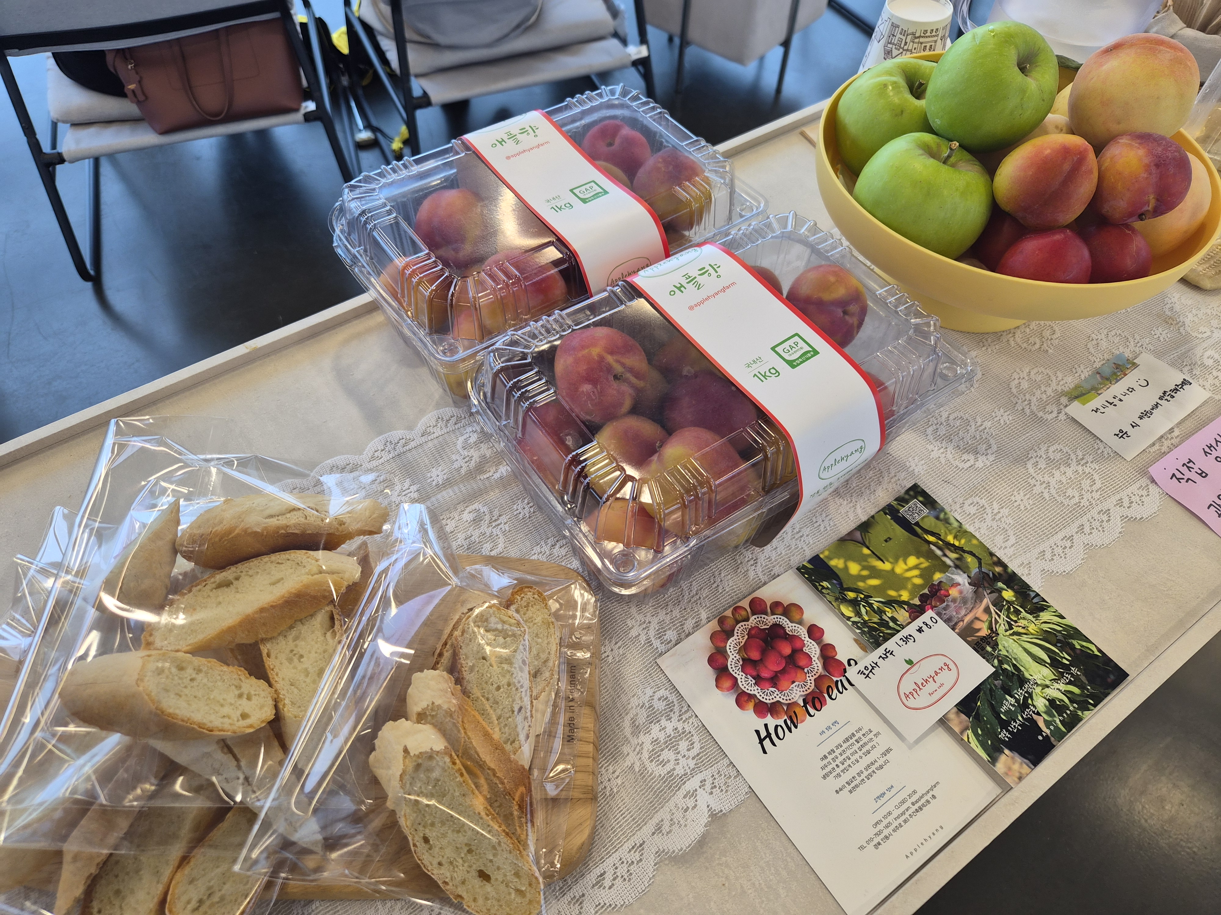 카페 카운터쪽에는 딸기파이 같은 디저트류와 오란다, 치아바타, 바게트 등을 구경해볼 수 있었고 자두와 사과, 복숭아 같은 과일도 직접 판매하고 있었습니다. 직접 생산한 과일들이라고 합니다.