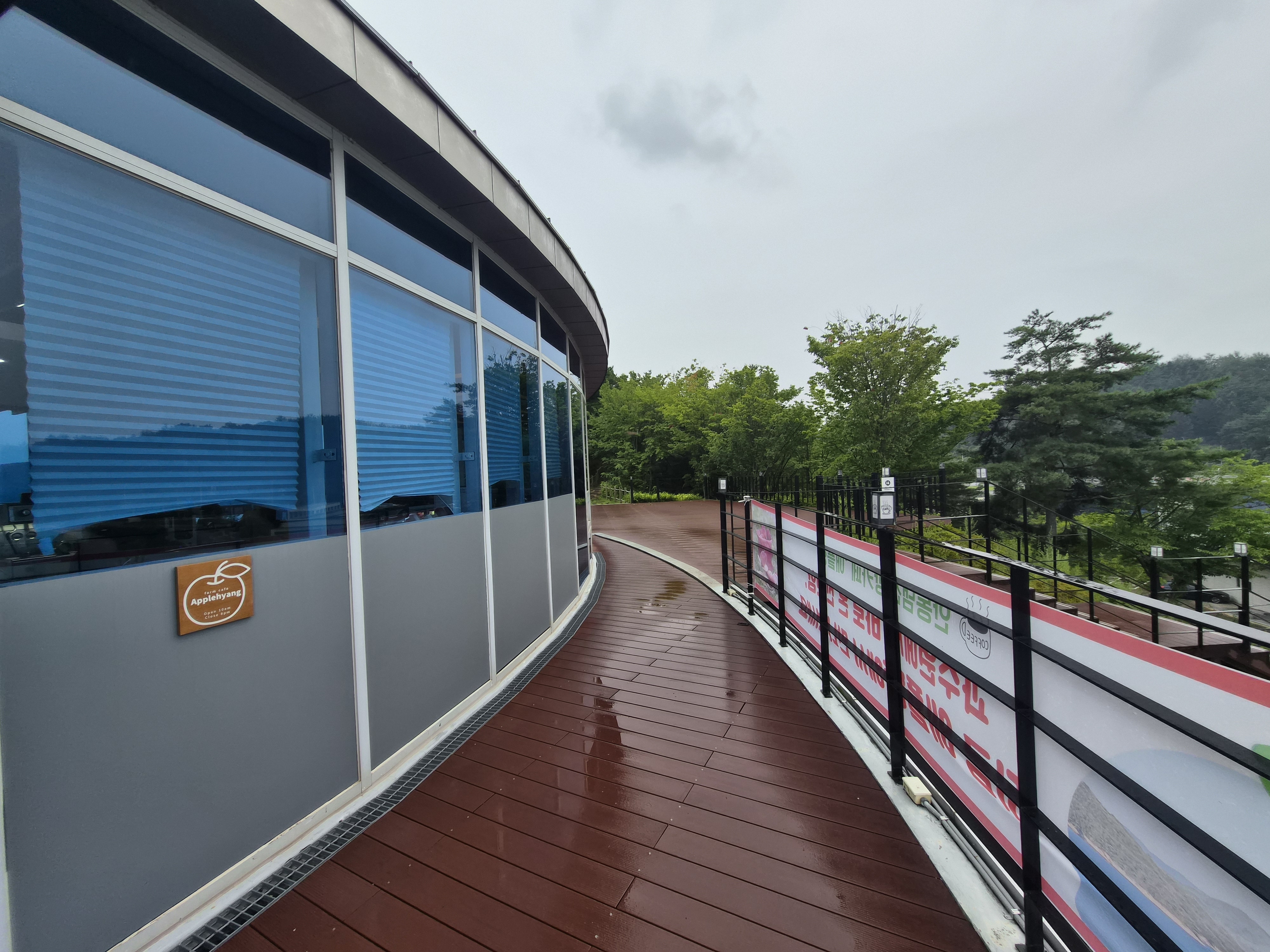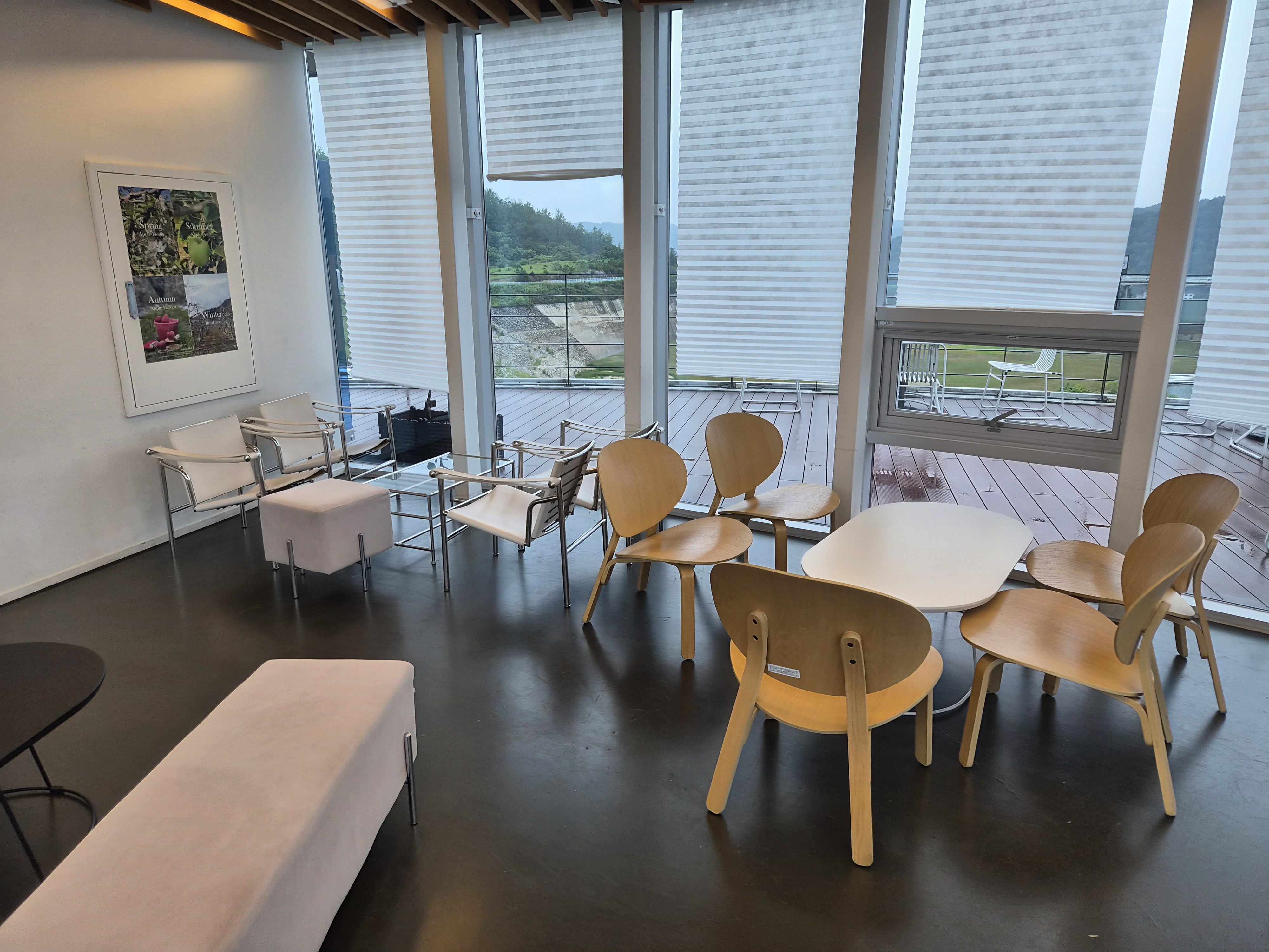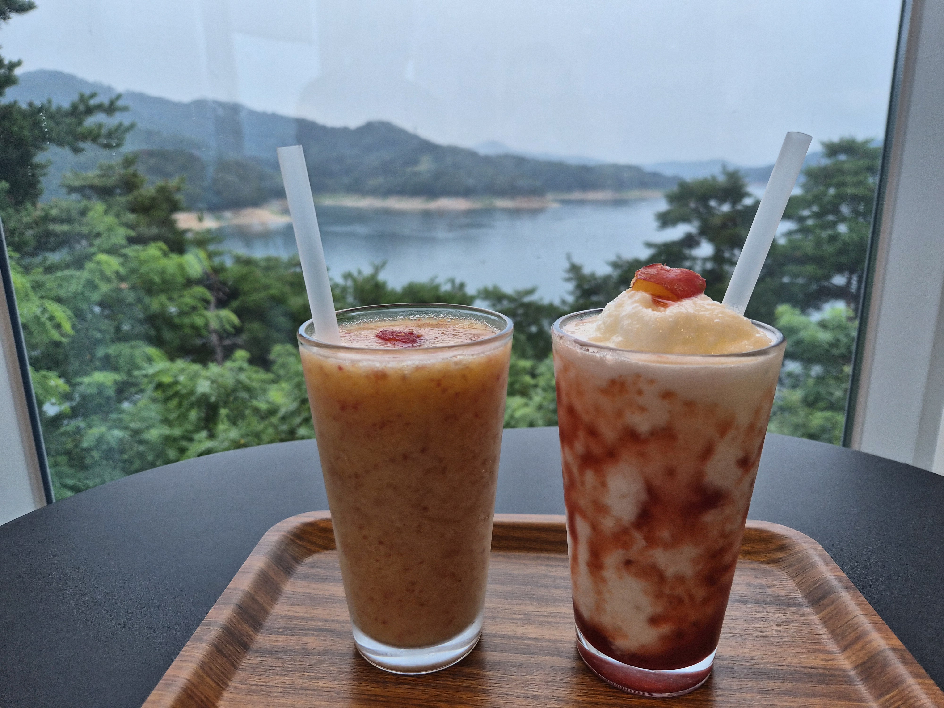 카페 내부는 창밖을 둘러보는 형식으로 구성되어 있었습니다. 아무래도 창가쪽이 안동호를 내려다보는 뷰가 나오는 곳이라서 어떤 자리에서도 창 밖 풍경을 볼 수 있었는데 예뻤어요. 애플향 카페 자체가 안동호가 한눈에 내려다보이는 전망 좋은 곳에 위치해 있다보니 아름다운 풍경을 배경으로 여유로운 시간을 보낼 수 있다는 점이 특별한 매력이었습니다. 통유리창 너머로 펼쳐지는 안동호의 풍경은 낭만을 만끽하기에 더없이 좋았어요.