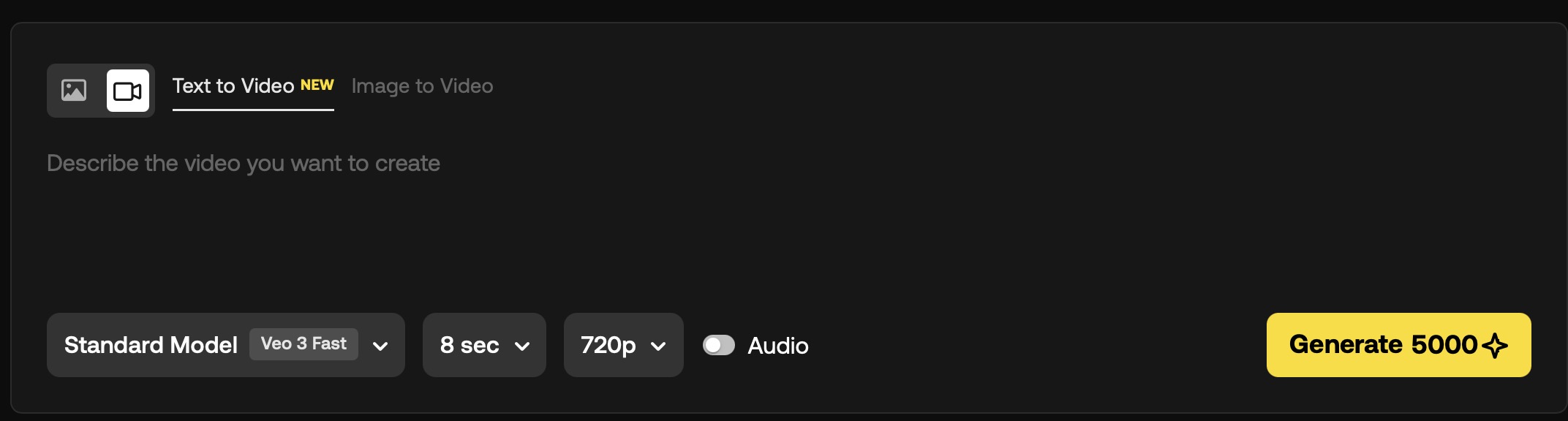 어떤 모델을 선택하느냐에 따라 소모되는 크레딧이 달라집니다. 예를들어 Lite 모델에서는 1600 크레딧이 소모되지만, Veo 3 Fast 모델인 스탠다드 모델로 생성하게되면 5000 크레딧이 소모됩니다. 따라서 먼저 만들고자하는 영상의 퀄리티를 생각해보고 모델을 결정해야합니다.