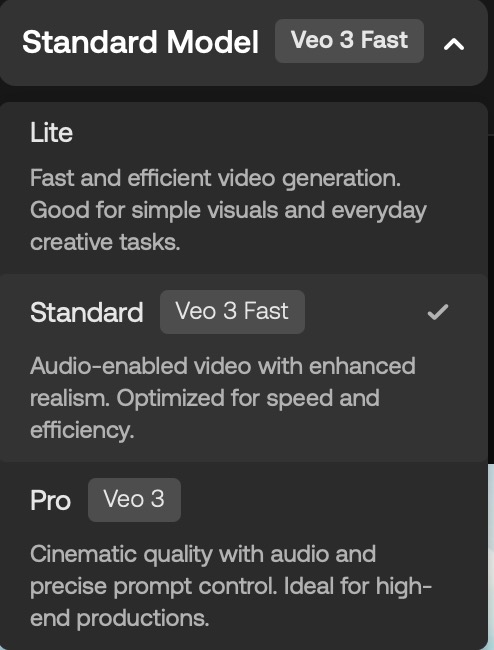| 스탠다드 (Veo 3 Fast) | Veo 3 모델을 사용하면서 고품질 영상을 만들 수 있습니다. 오디오가 필요하지 않을 때 씁니다. |