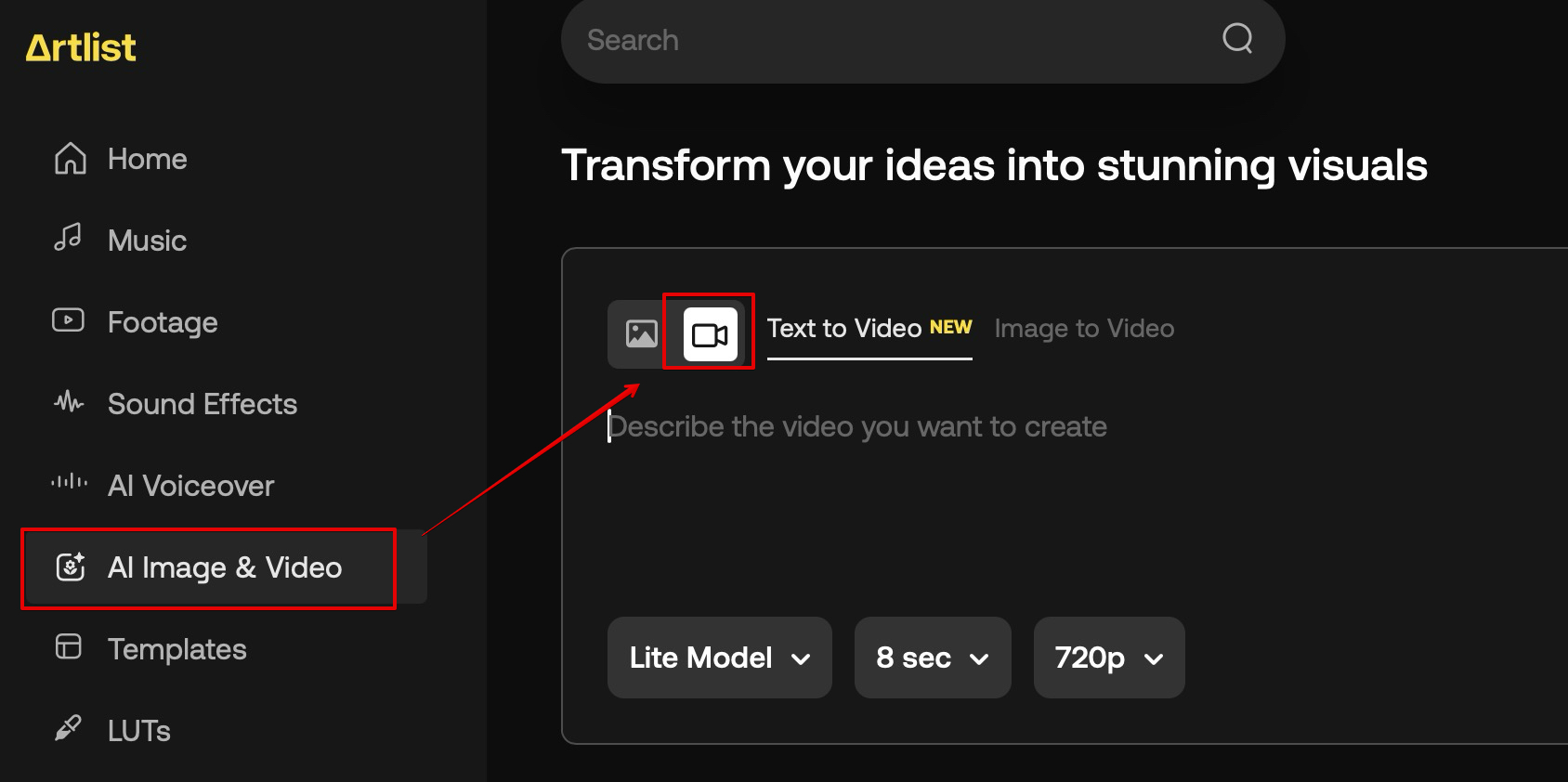 아트리스트 메뉴에서 <AI Image & Video>를 클릭합니다. 오른쪽 화면에 프롬프트 입력창이 나오면 위쪽에서 이미지 표시가 아닌 동영상 표시를 클릭합니다.