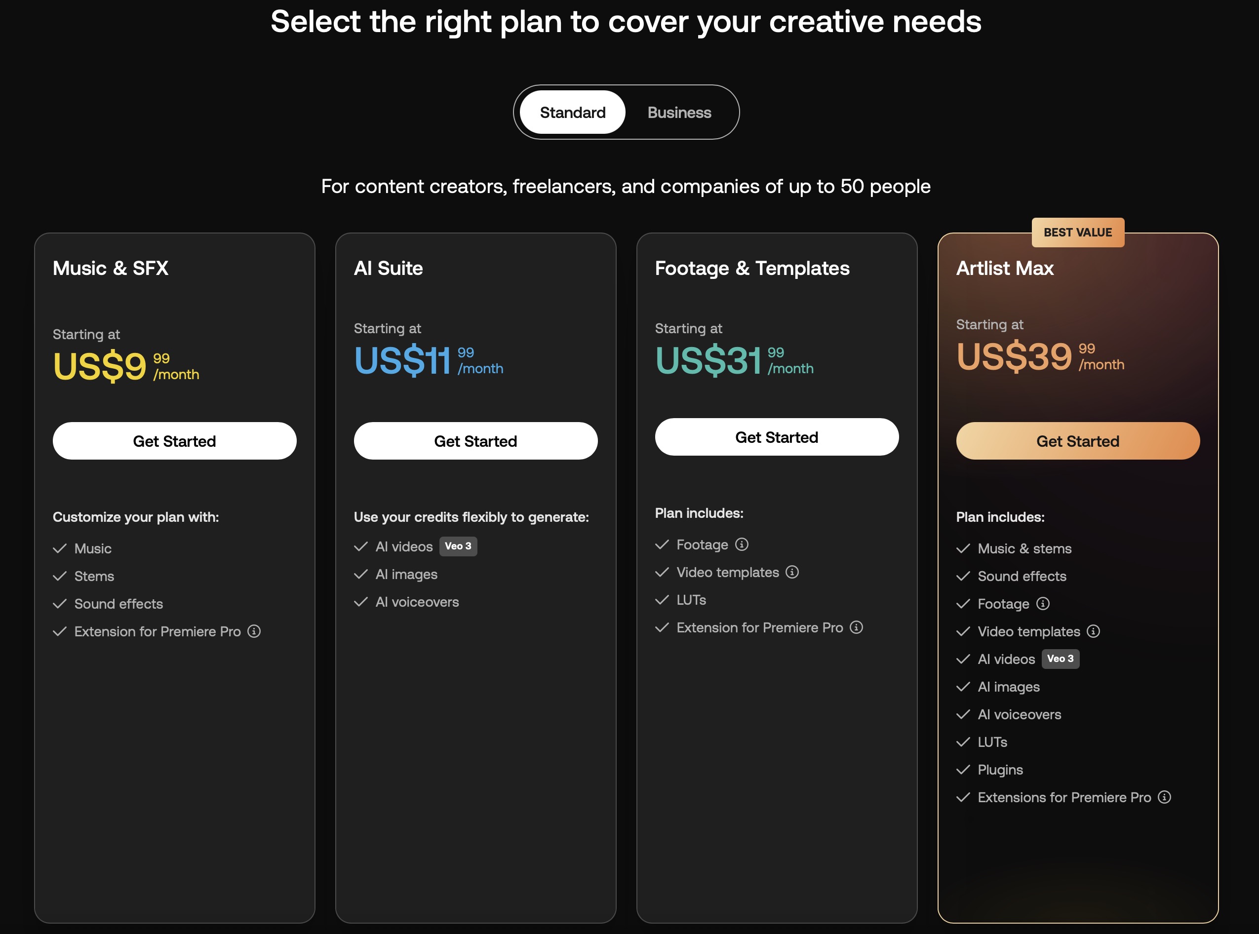 아트리스트에서 Veo 3는 AI Suite 및 Max 구독에 포함되어 있으며 각 생성에 대해 AI 크레딧을 소모합니다. 따라서 아트리스트에서 Veo 3를 비롯한 AI 기능을 사용하려면 AI 크레딧을 갖춘 플랜을 구독하고 있어야합니다. (유료모델, 가격은 플랜에 따라 다름)