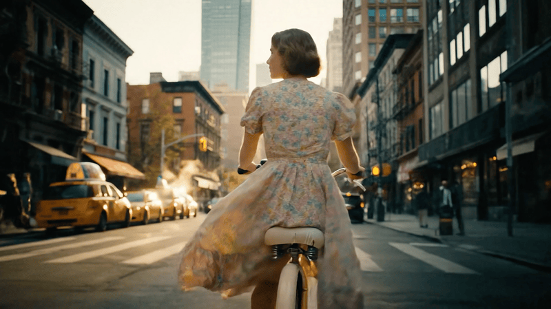 PROMPT: A medium frontal shot of a young woman riding a vintage cream-colored bicycle through the streets of New York City. She has short brown hair and wears a flowing, floral-patterned vintage dress that flutters slightly in the wind. Her expression is calm and focused, eyes looking straight ahead as she pedals gently through the city.