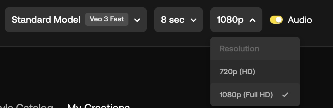 해상도는 720p와 1080p를 제공합니다. 현재 최대 8초까지 생성할 수 있으며 만들 때마다 소모되는 크레딧이 해상도에 따라 달라지기 때문에 해상도도 잘 결정해야합니다. 엄청 고화질이 필요한 경우가 아니라면 720p로도 적정 수준의 영상을 만들 수 있습니다.