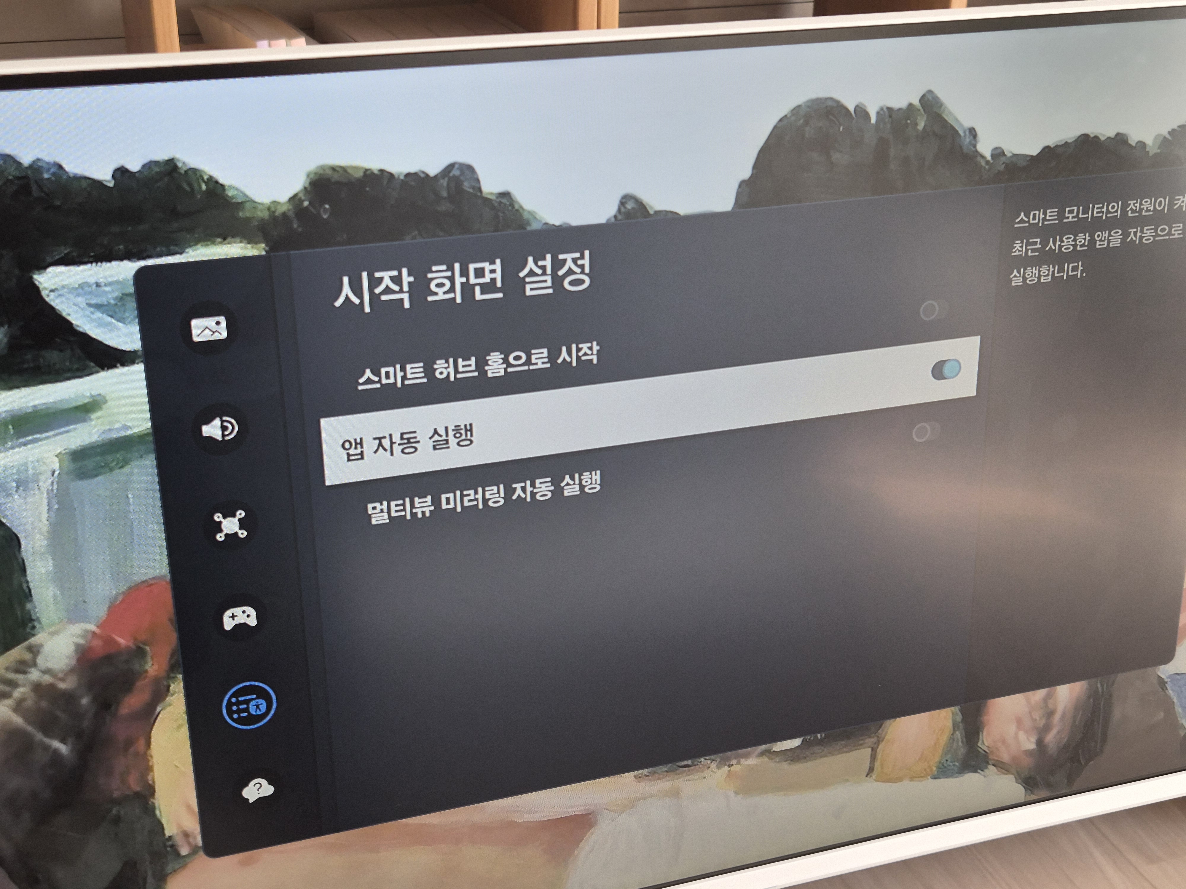 삼성 스마트모니터인 이른바 삼텐바이미로 유튜브 틀어놓고 보고 싶은데 껏다 켤 때 마다 다시 초기화되어서 처음에 나오던 삼성 스마트허브 티비가 자동으로 나와서 불편했다. 그래서 티비를 껐다가 다시 켰을 때에도 이전에 보던 앱이 그대로 계속 나오면 좋을 것 같아서 설정을 찾아보다가 있길래 포스팅.