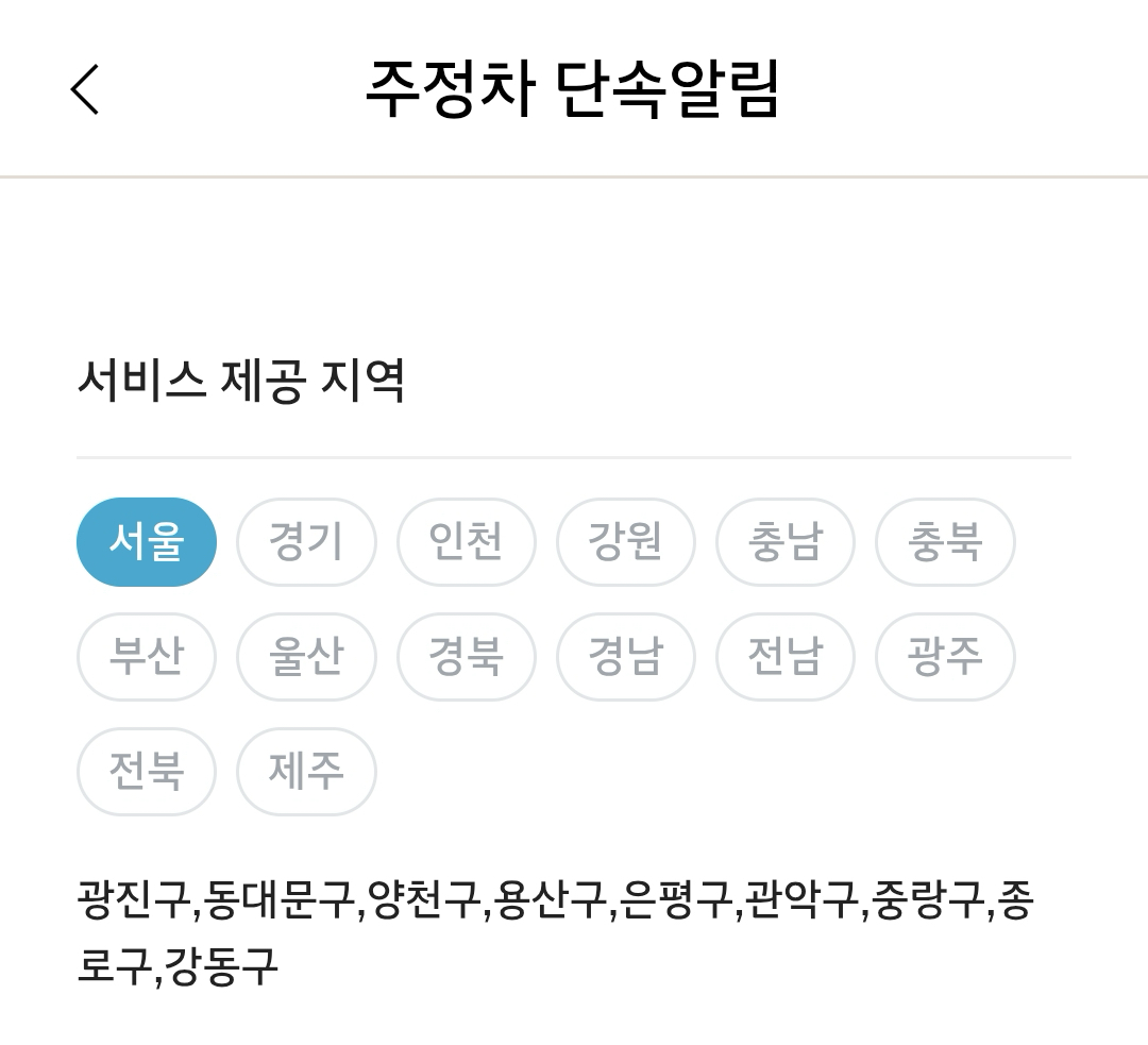 대구에 살게된 이후 잊고 살다가 이번에 생각나서 좀 찾아보았다. 휘슬 앱에 보면 신청 가능한 지역 목록에 대구가 빠져있는걸 볼 수 있다. 대구가 휘슬 앱에서 빠져있는 이유는 대구에서는 시 자체적으로 주정차단속알림 서비스를 시행하고 있기 때문이다.