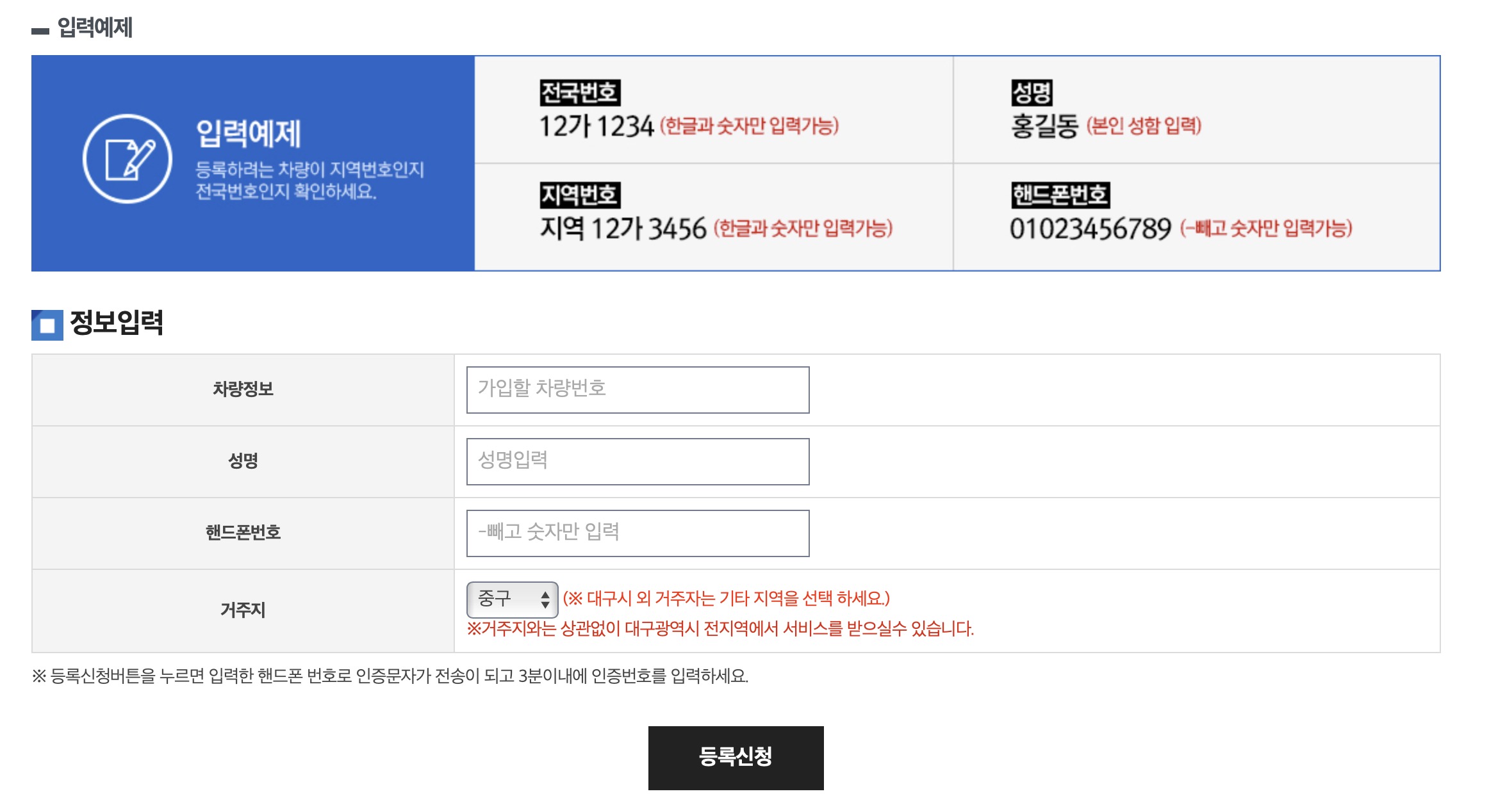 차량정보 번호 및 이름, 핸드폰번호, 거주지 등록해주고 등록신청한 후 인증번호를 넣으면 끝.
