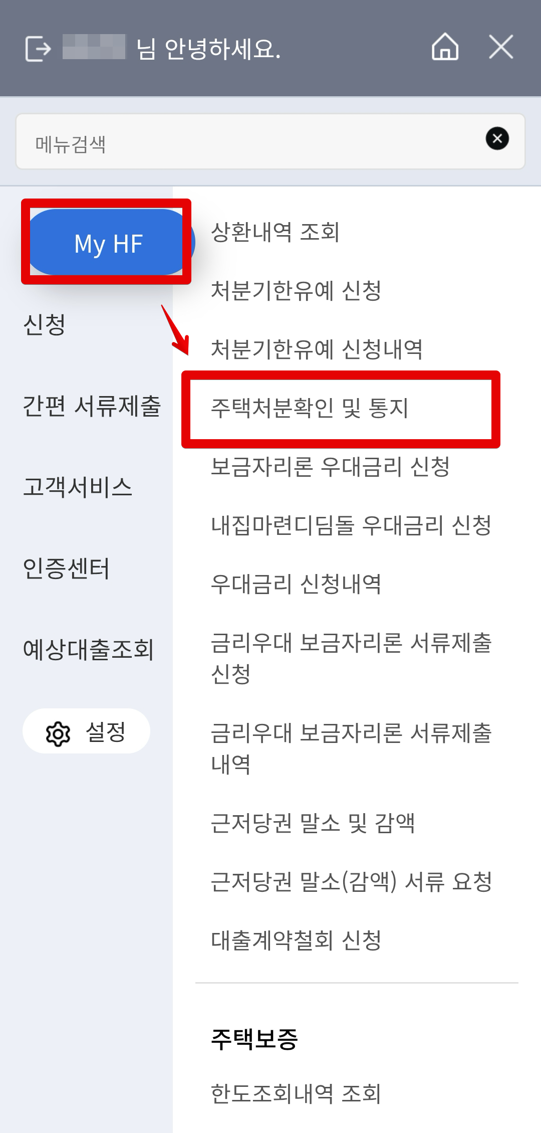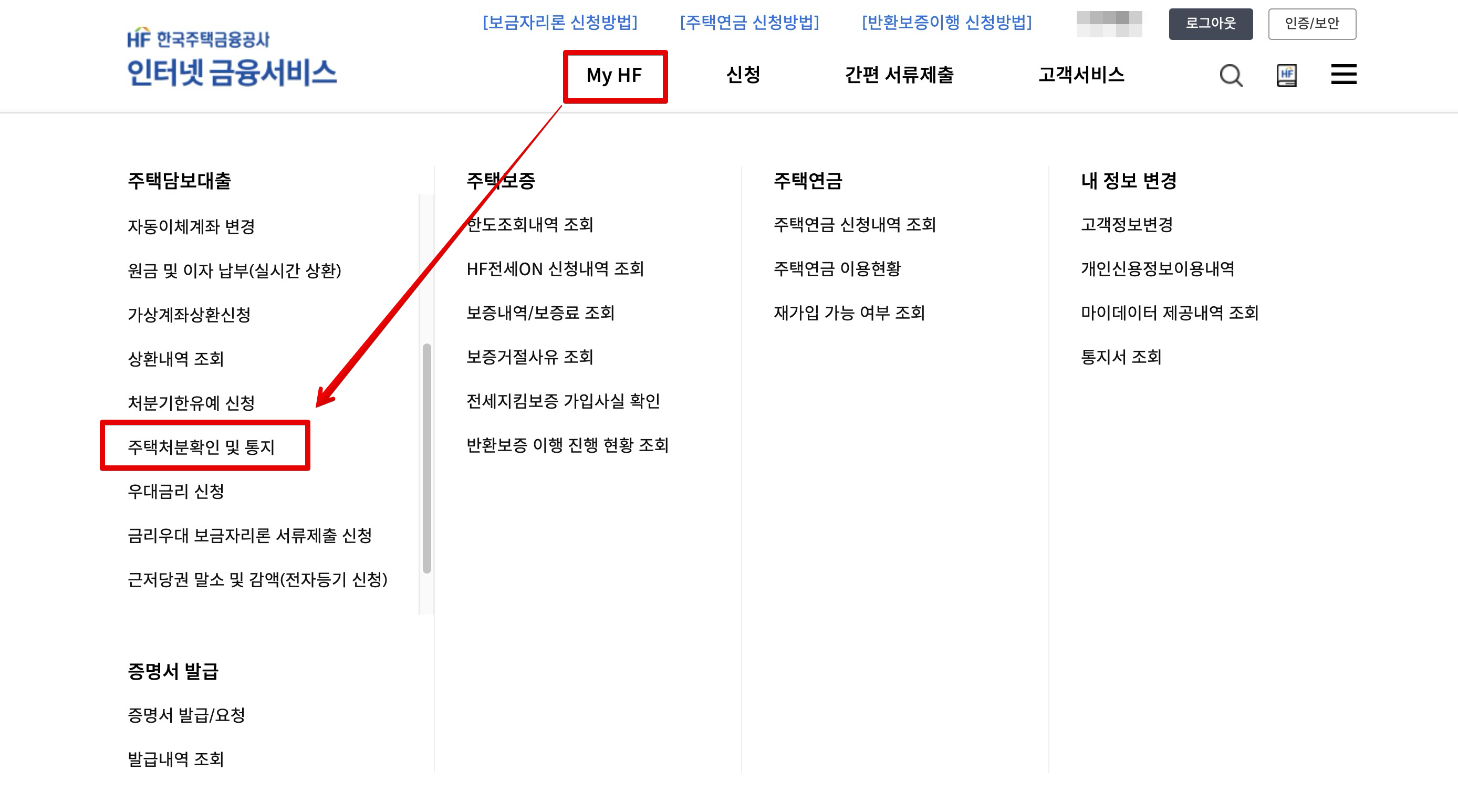 한국주택금융공사 HF 보금자리론 기존주택 처분 주택처분확인 및 통지 방법