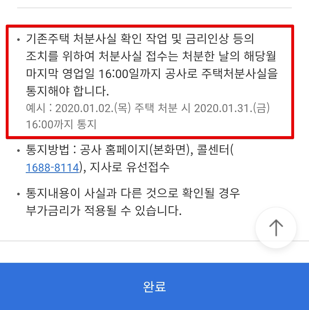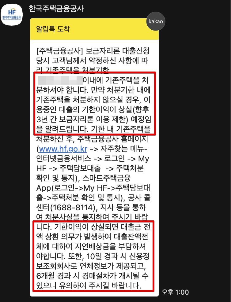 아무튼 보금자리론 대출 실행일 이후 6개월 정도가 지난 시점(나의 경우 대출실행일 6개월+1일되는 시점)에 위와같은 카톡이 왔다. 기존주택 처분을 조건으로 대출 받았으니 기존 주택 처분을 했다면 주택처분확인 및 통지를 하라는 이야기다. 그렇지 않을 경우 기한이익 상실되면서 대출 회수 들어오고, 연체되면 지연배상금 및 경매가 진행될 수 있다는 무시무시한 알림이다.