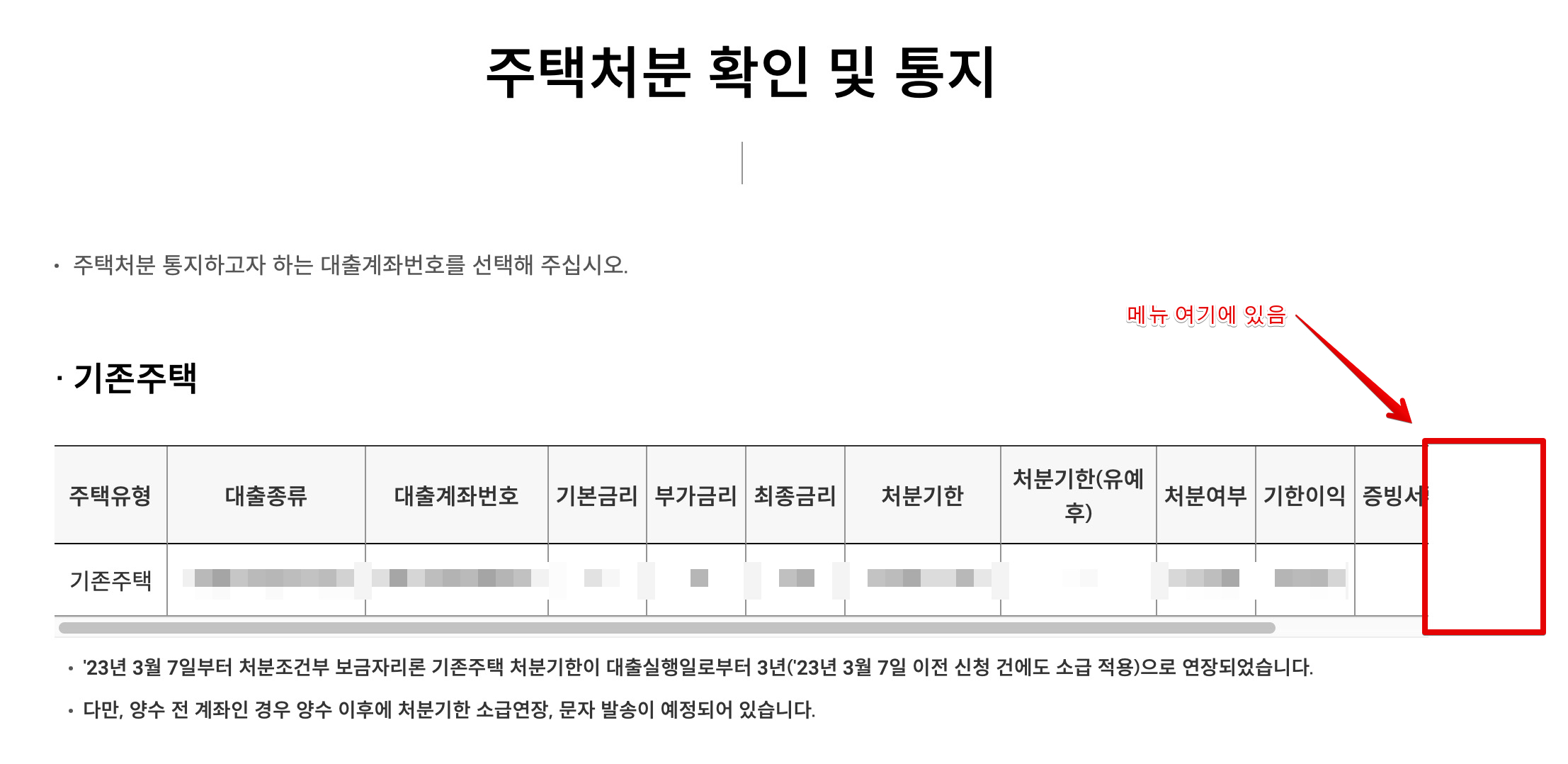 여기에보면 주택처분 확인 및 통지를 확인할 수 있는 기존주택(지금 살고있는 집)에 대한 내역이 나타난다. 그런데 여기에서 문제가 뭐냐하면, 기존주택 처분 신청을 하려면 메뉴가 있어야하는데 메뉴가 가로 스크롤로 제일 뒤에 있어가지고 잘 보이지 않게끔 되어 있다는 점이다. 그래서 잘 모르는분들이라면 옆에 메뉴 있는줄 모르고, 직관적으로 이해하기 쉽지 않아서 찾기가 어렵다.