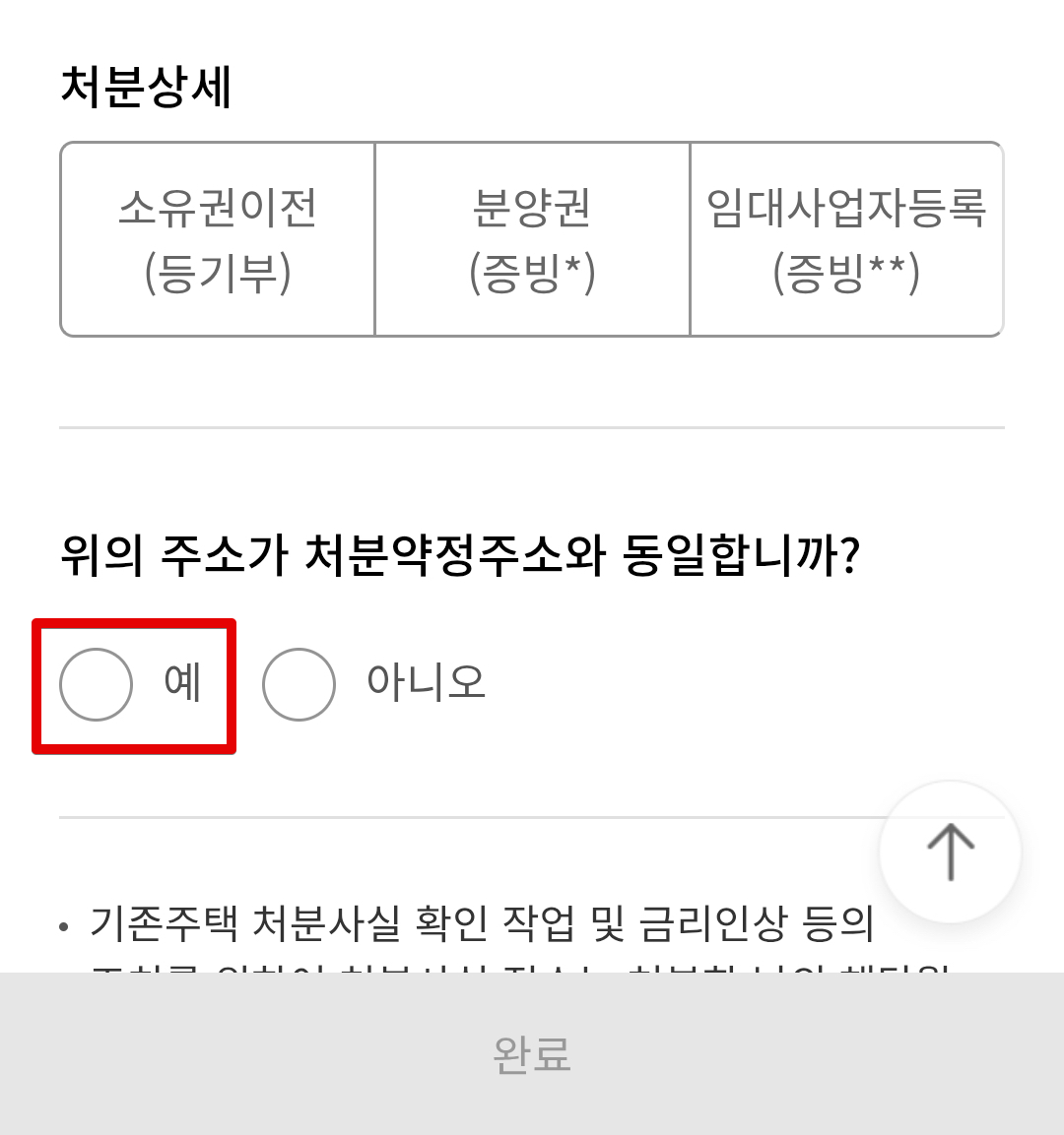 스크롤을 아래로 내리면 주택처분사실 통지 화면이 나타난다. 웹사이트에서 가로 스크롤에 가려져있던 부분으로 보인다. 여기에서 처분여부를 <처분함>으로하고 처분상세의 경우 맞는걸 진행해주면 된다. 보통의 경우 <소유권이전(등기부)>로 하면 된다. 그리고 아래에 처분약정주소 동일여부를 <예>로 체크해준다.