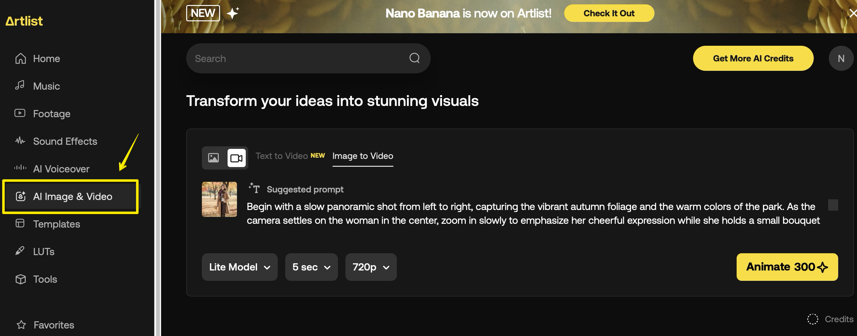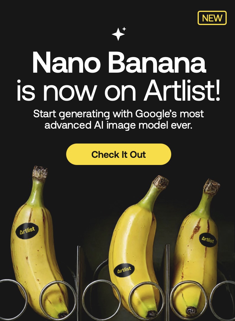 나노 바나나는 이미 아트리스트(Artlist)의 AI 이미지 및 비디오 생성 도구에 통합되면서 바로 사용할 수 있습니다. 아트리스트(Artlist)에서 나노 바나나를 사용하는 방법은 매우 쉽습니다.