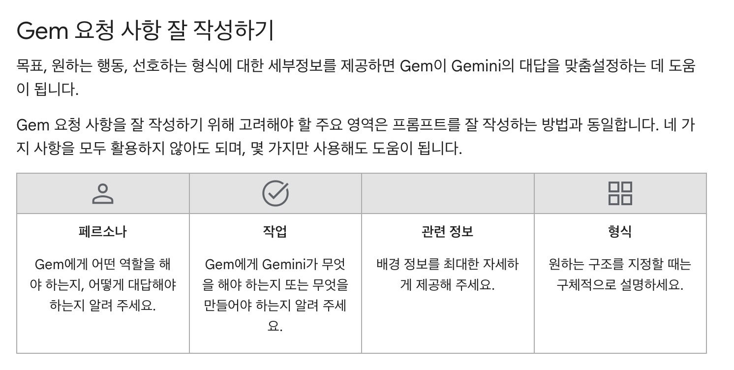 Gem을 그냥 만드는게 아니라 '잘' 만드는게 무엇보다 중요하기 때문에 이 부분에서 지시사항을 명확하게 해주어야한다. 구글에서 공식적으로 이야기하는 Gem 요청사항 작성법은 위 그림과 같다. 크게 4가지가 있는데 원래는 이 4가지 요소를 모두 프롬프트로 지시했어야하지만, Gem을 만들어서 활용하게되면 이미 지시사항을 이해하고 있기 때문에 프롬프트에서 지시할 필요가 없어진다.