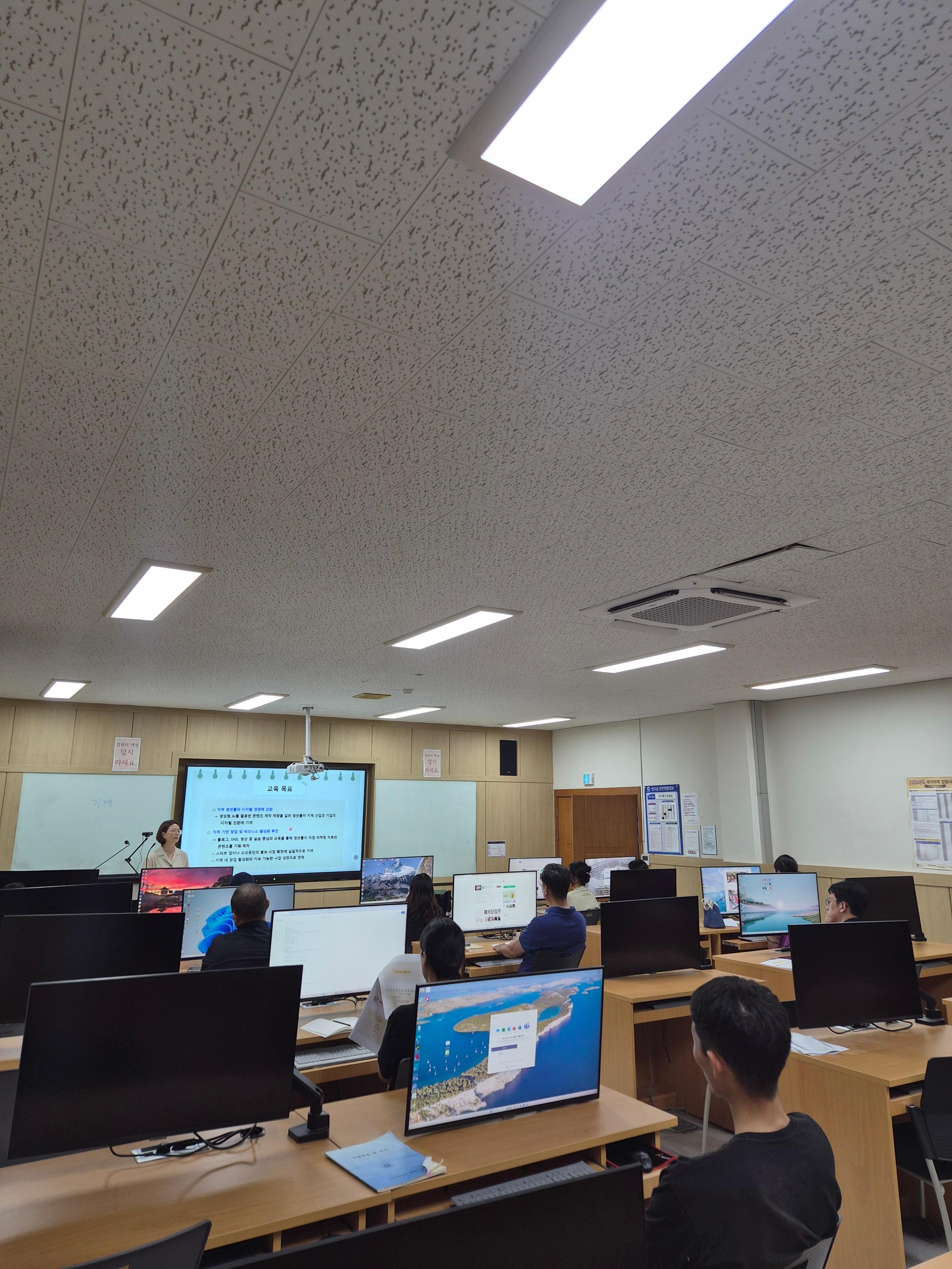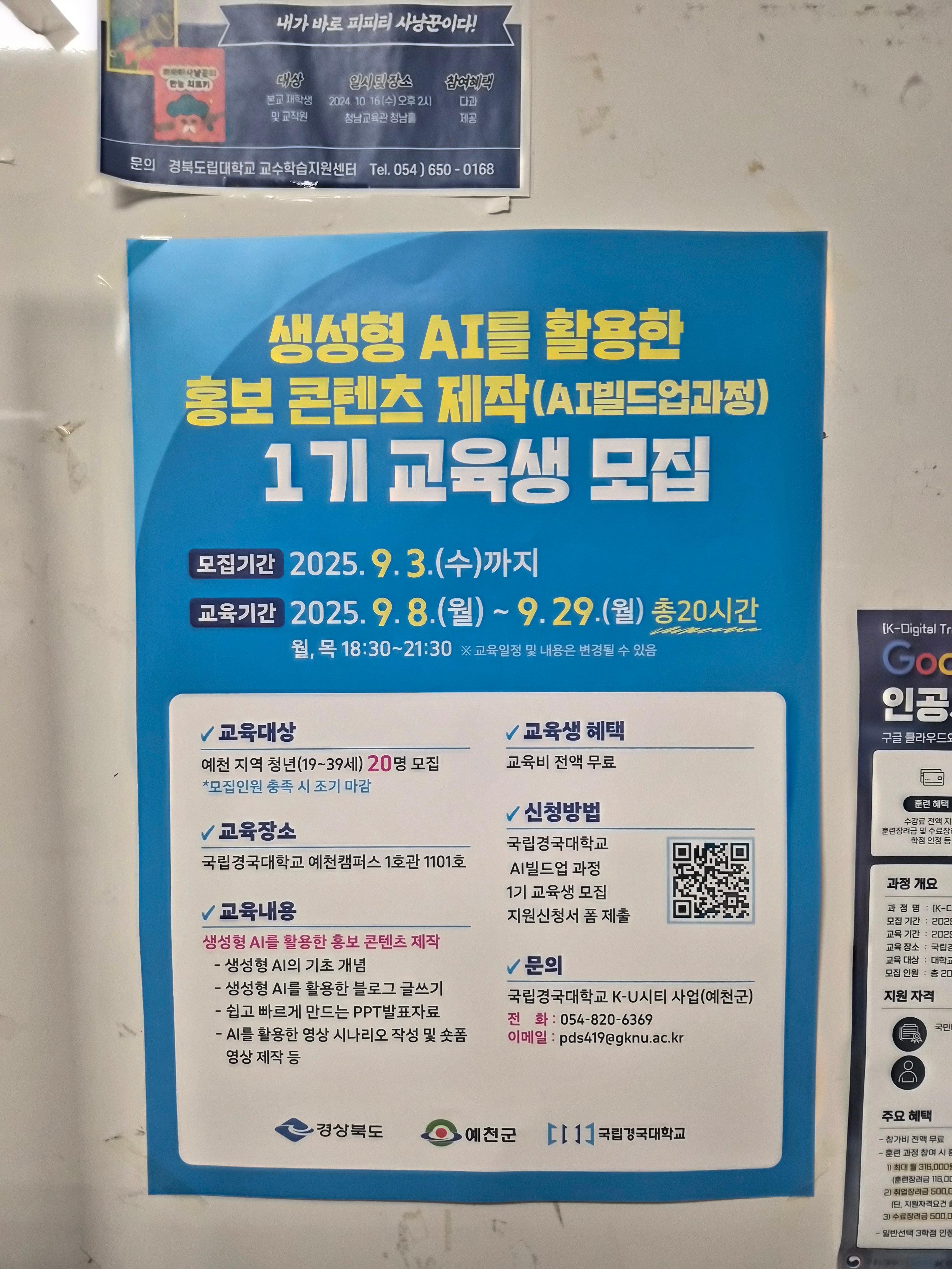 경상북도와 예천군, 국립경국대학교에서 함께하는 교육으로서 국립경국대학교 예천캠퍼스 제1강의동 1층에 있는 강의실에서 강의 진행이 되었습니다. 교육은 생성형 AI를 활용한 홍보 콘텐츠 제작 AI빌드업 과정의 타이틀로 생성형 AI를 활용하는 다양한 방법들과 콘텐츠 제작 과정들을 총 20시간동안 학습해보는 과정입니다.