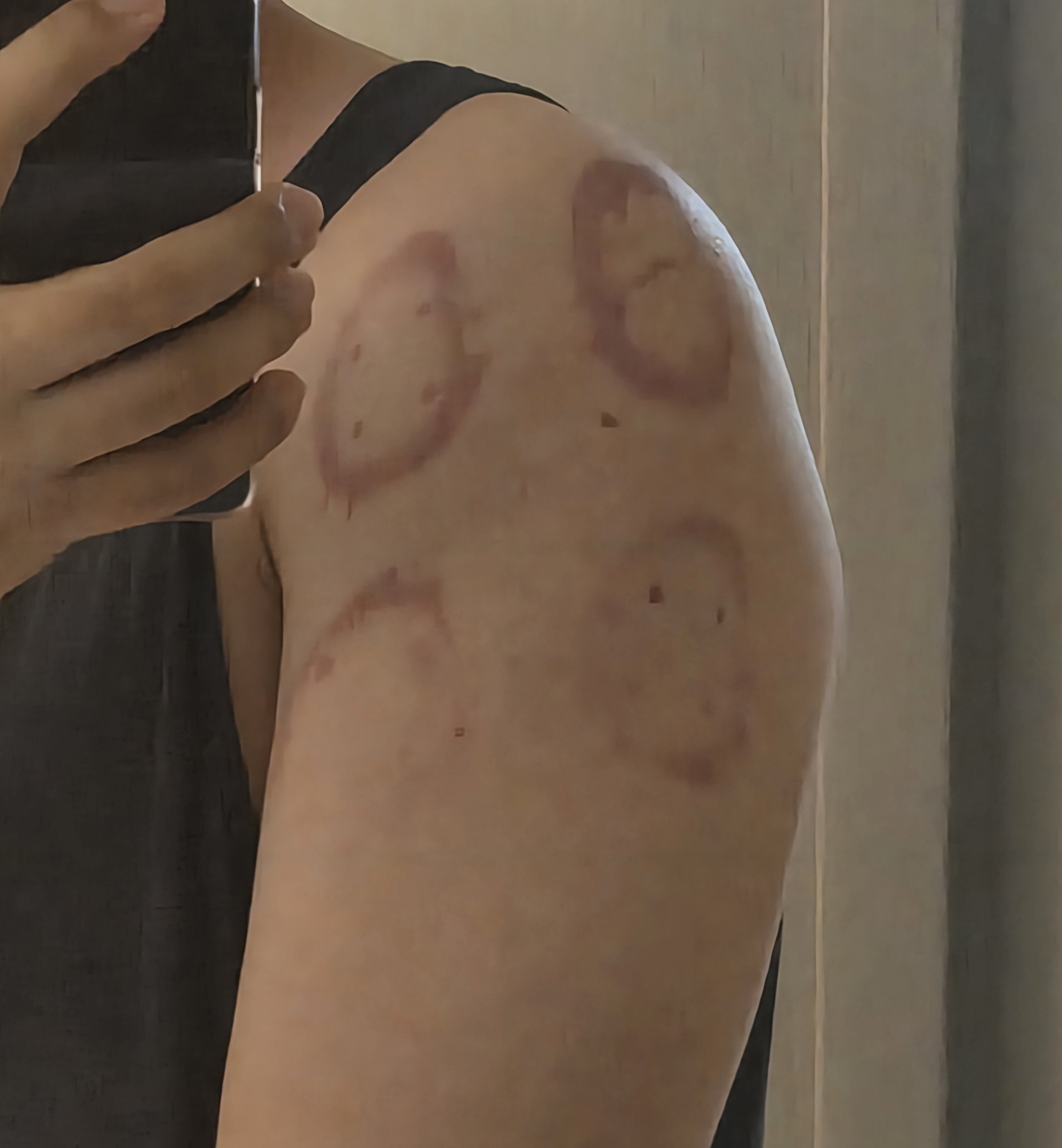 처방전 받고 물리치료실로 가서 약 35분 정도 물리치료 받았다. 물리치료 받으니까 부황 뜬 것 같은 자국이 남았다.