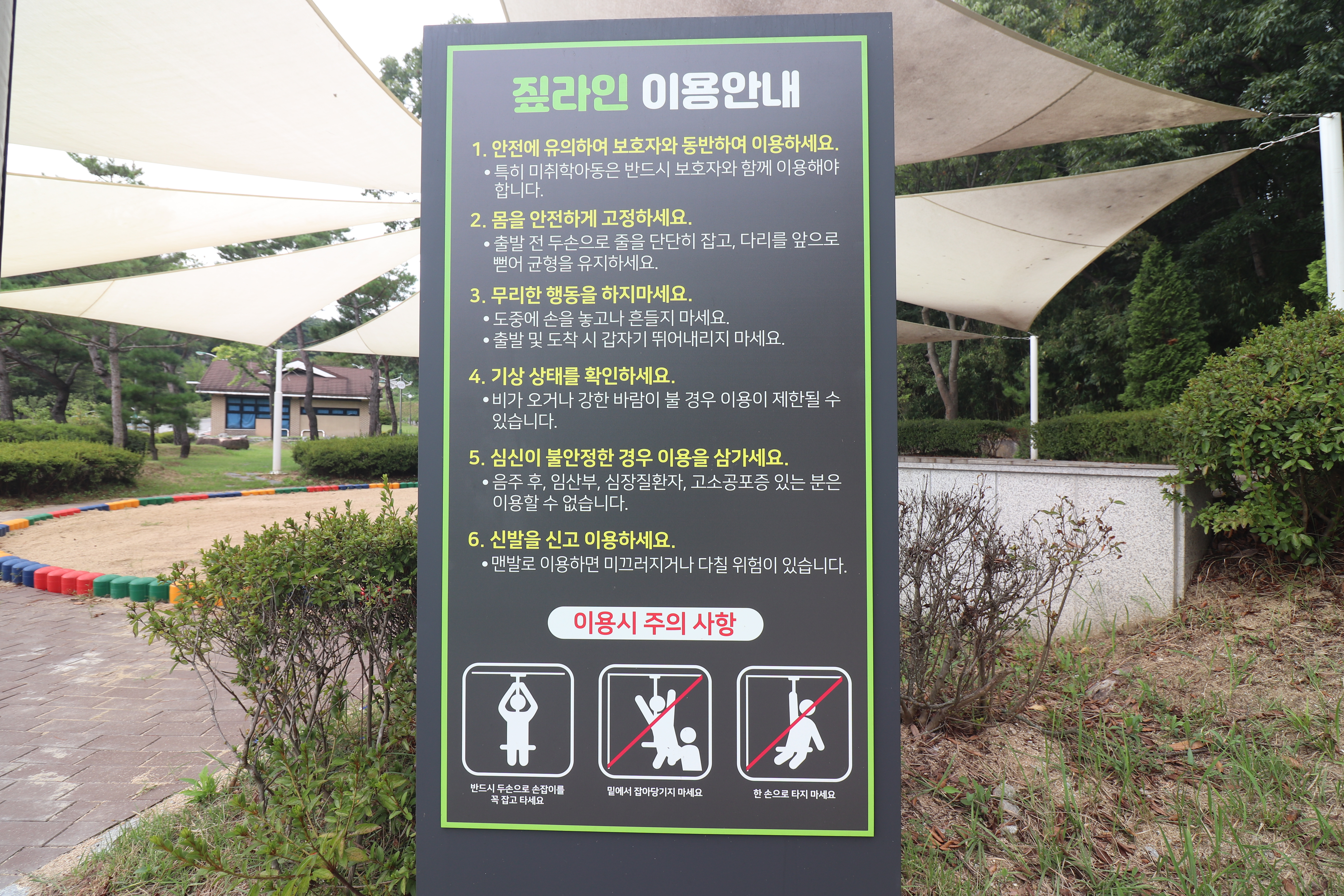 정글짐과 미끄럼틀, 짚라인 등 스릴있는 기구들이 많습니다. 이용에 앞서 이용안내 표시가 있으므로 읽어보시면 더욱 안전하게 이용이 가능하겠습니다.