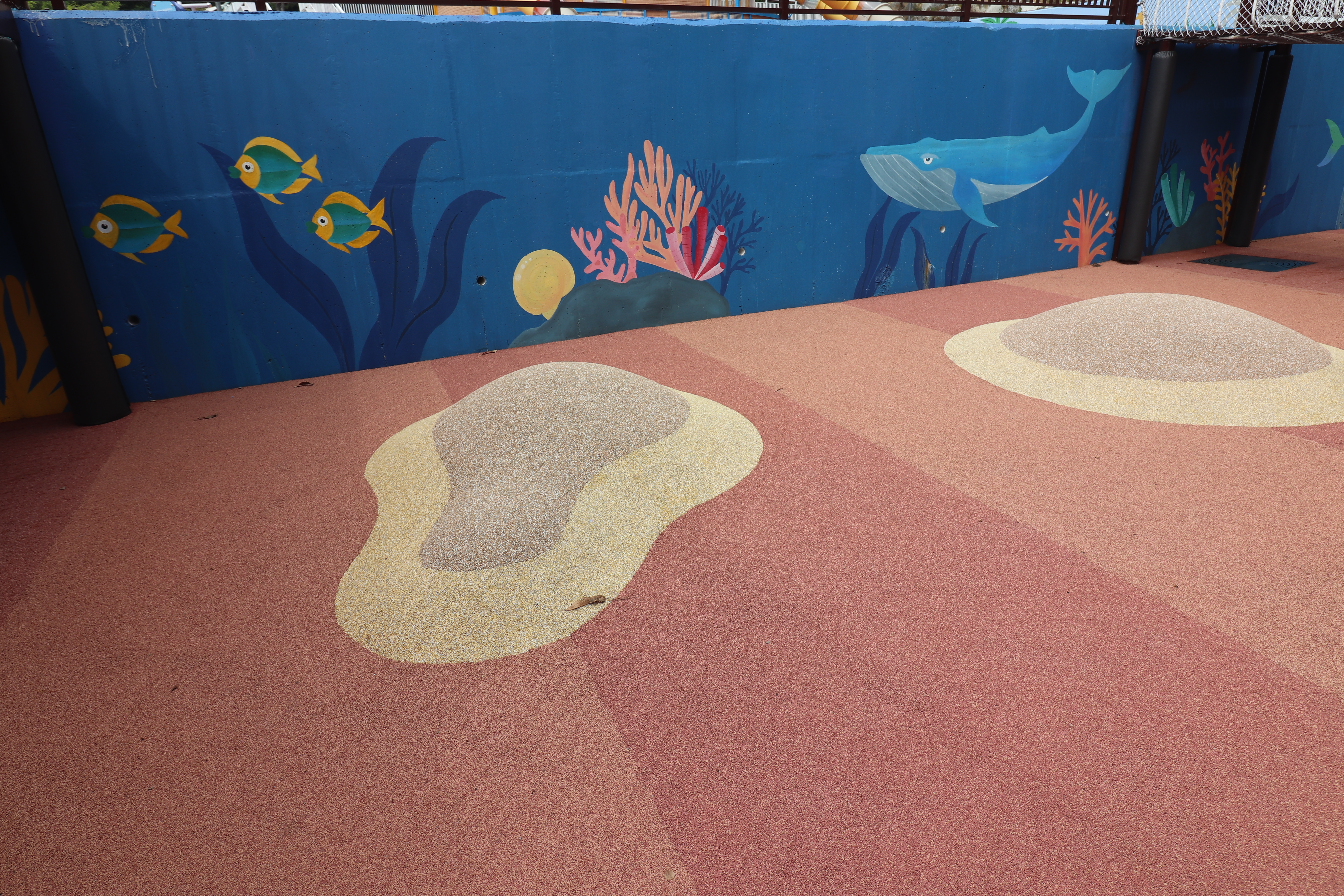 입구쪽에서 간단한 설명과 안내를 볼 수 있습니다. 놀이터는 규모가 꽤 큰 편이고 시설도 다양하게 구비되어 있었습니다. 벽면으로는 바다 그림과 별주부전의 주인공들인 토끼와 거북이 등 다양한 그림들이 있어서 바다속에 있는 놀이터 같은 느낌도 있었습니다.  아이들의 호기심을 자극하고 상상력을 부풀리는 거대한 해저 같았어요.