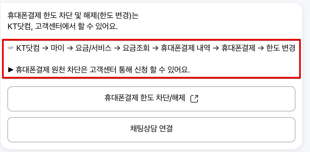 KT에서 소액결제를 차단하는 방법은 크게 3가지가 있는데 가장 쉬운건 한도변경이고, 다음으로 안전한건 원천 차단으로 보인다. 한도변경의 경우 KT닷컴 - 마이 - 요금/서비스 - 요금 조회 - 휴대폰 결제 내역 - 휴대폰 결제 - 한도 변경 메뉴에서 이용할 수 있다.