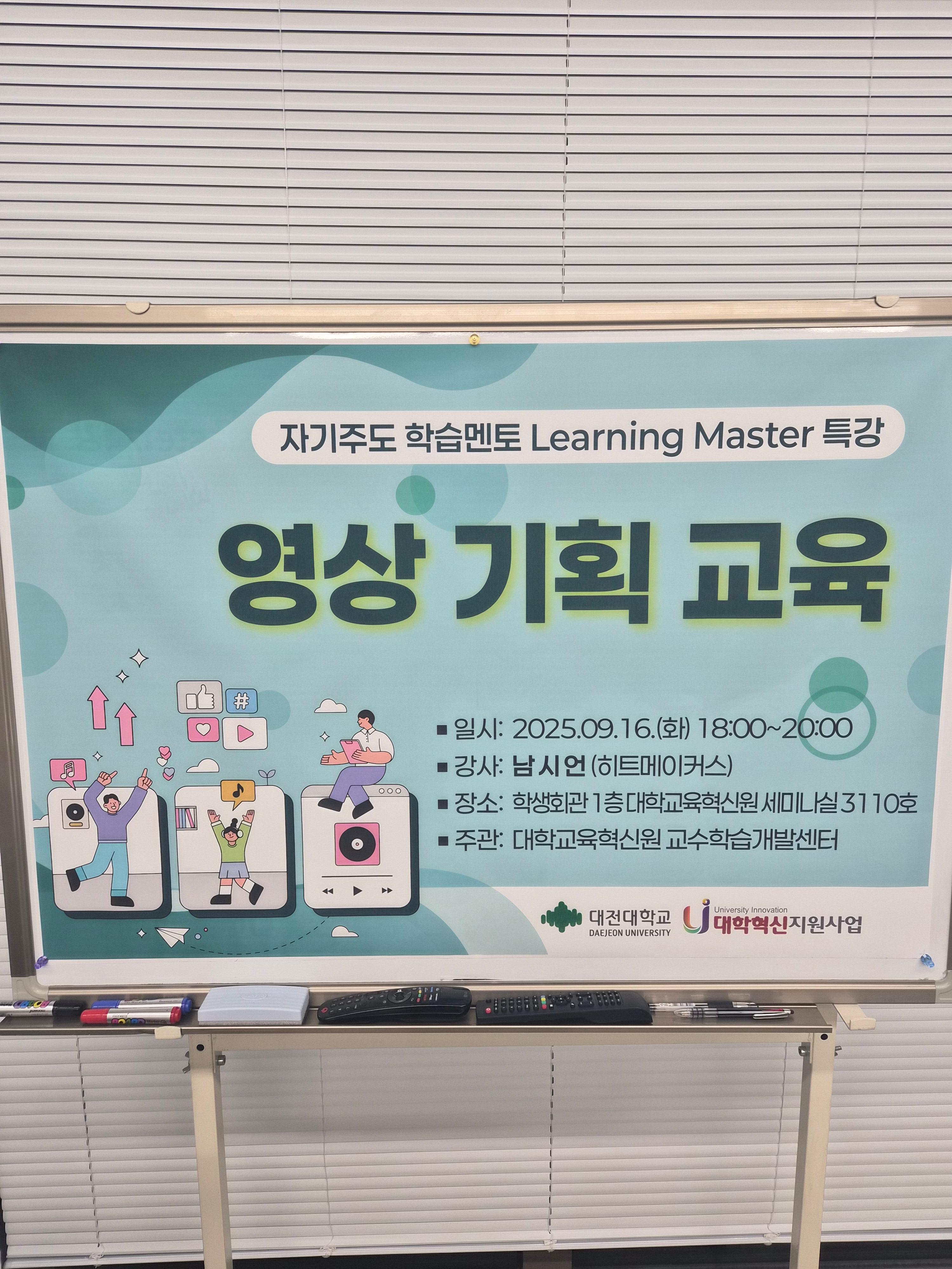 대전대학교에서 진행되는 자기주도 학습멘토 러닝마스터 특강 프로그램 중 영상 기획 교육을 진행했습니다. 학생회관 1층 대학교육혁신원 세미나실에서 진행되었습니다. 영상 제작 과정에선 아무래도 기획이 우선시되고 기획이 중요하기 때문에 이러한 부분들을 실무적으로 다양하게 설명하였습니다.