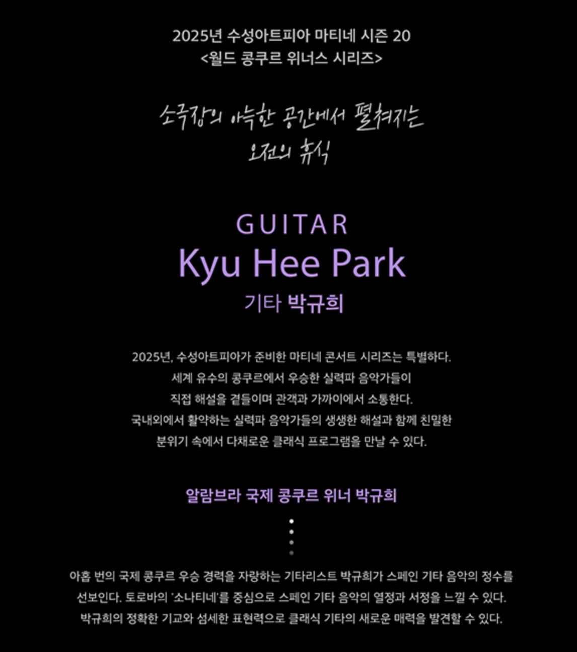 - 공연명: 월드 콩쿠르 위너스 시리즈 2025 마티네 콘서트 <기타 박규희>