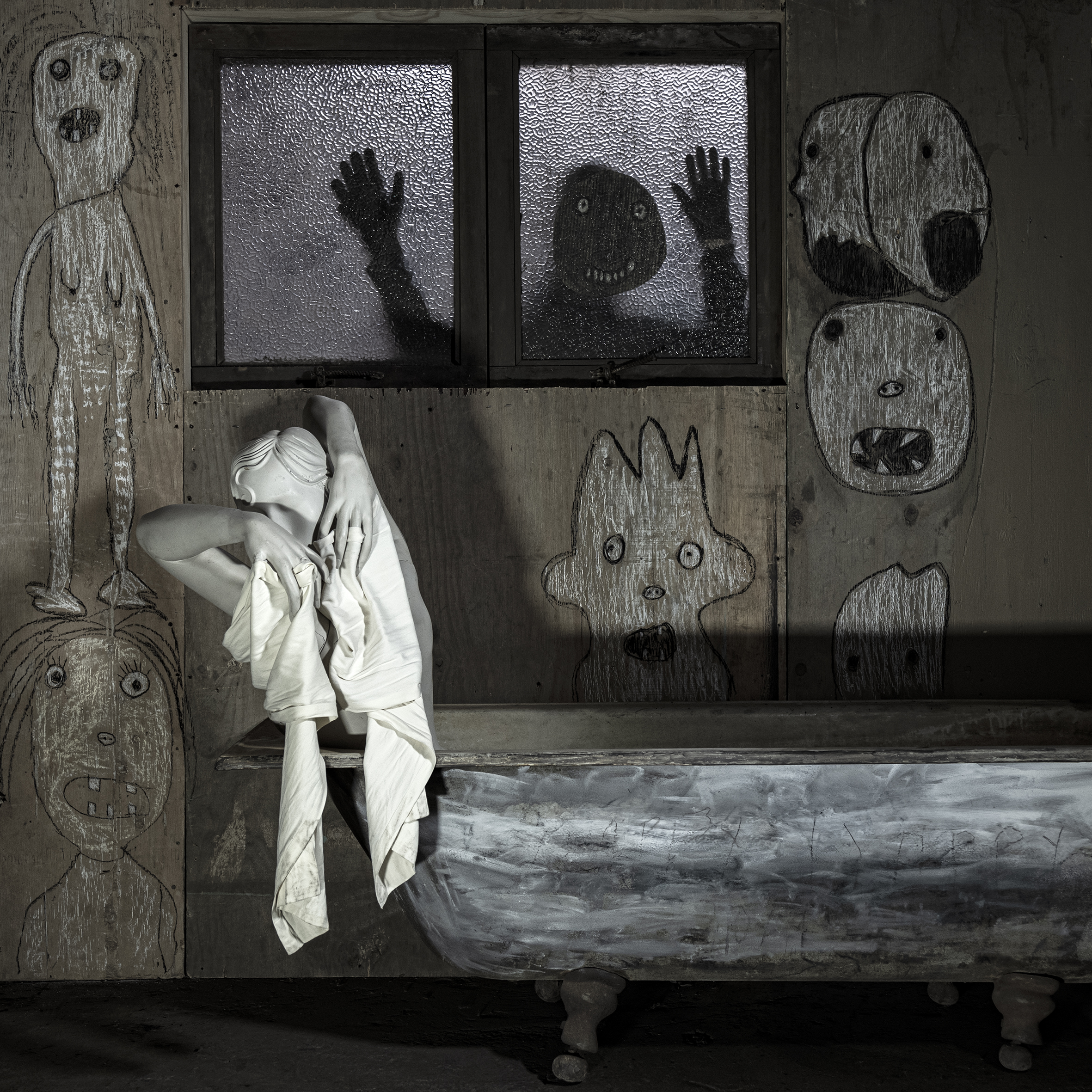 그의 사진 속에는 연출된 세트와 인물, 폐허가 된 공간과 낡은 오브제들이 뒤섞여 한 편의 심리극 같은 무대를 만들어냅니다. 낡은 벽의 낙서, 동물 사체, 기괴한 가면과 인형 등은 강렬한 흑백의 대비 속에서 불안과 긴장감을 자아내며, 꿈과 현실의 경계에서 인간 본질에 대한 철학적 질문을 던집니다.