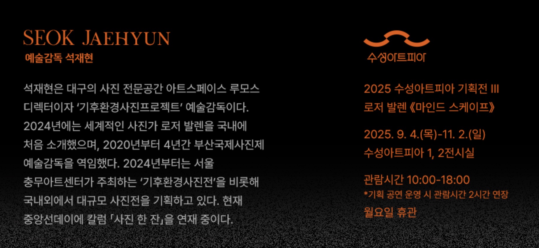 이번 수성아트피아 <MIND SCAPE>전은 로저 발렌의 50여 년 예술 세계를 총체적으로 경험할 수 있는 드문 기회입니다. 작가의 대표 시리즈 4개가 엄선되어 소개되며, 국내에서는 처음 공개되는 신작도 포함되어 기대를 더합니다. 이 외에도 영상, 포토북, 미공개 작품 등 다양한 매체를 통해 그의 깊이 있는 통찰을 입체적으로 조명할 예정이라고 합니다.