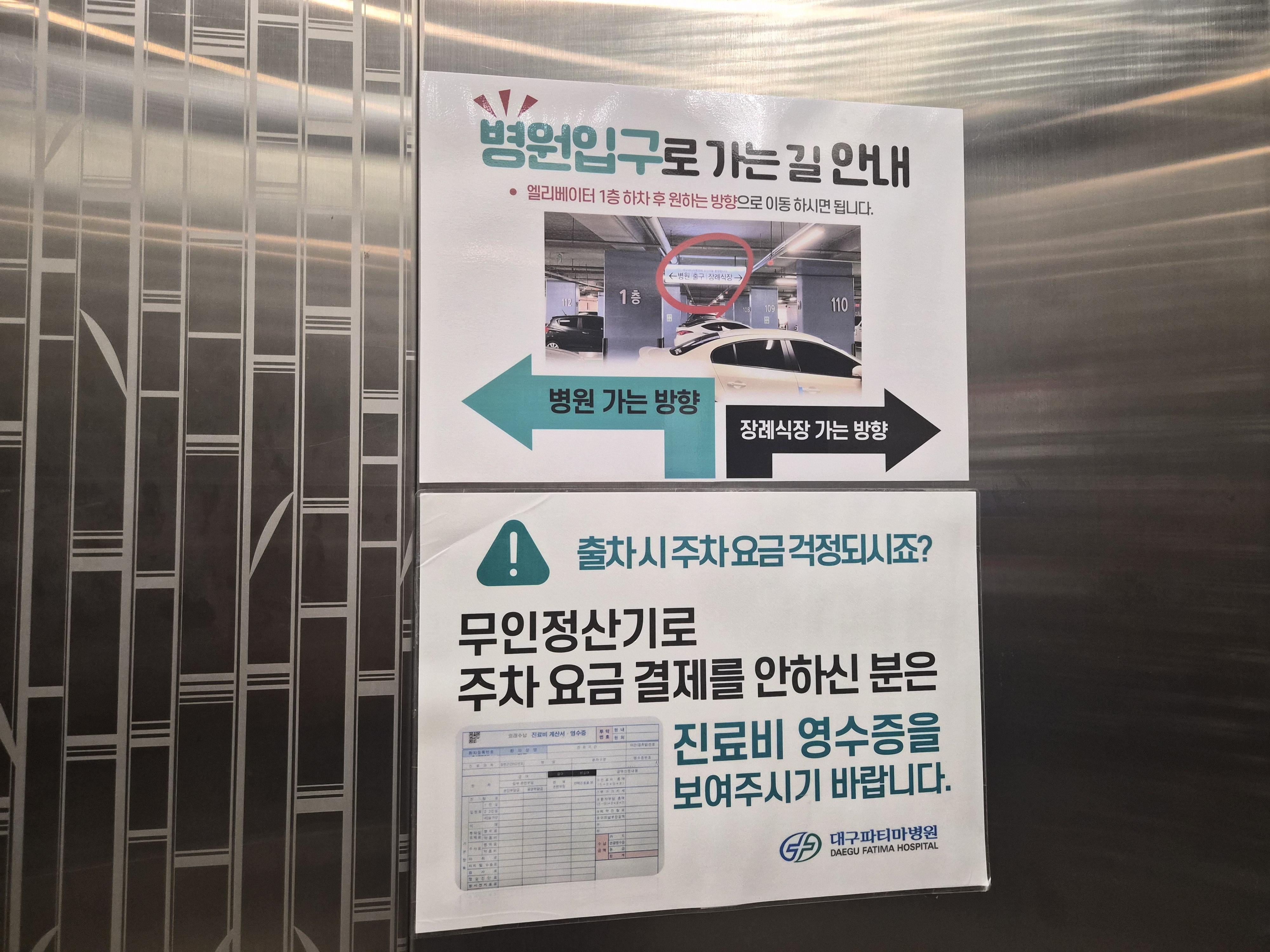 주차장에 주차 후 1층으로 가야한다. 좀 복잡하기 때문에 잘 찾아야하는데 대구 파티마병원의 경우 공단 검진을 하는 곳이 있고 일반 검진을 하는 곳이 있다. 공단 검진의 경우 본관 지하 1층으로 가야한다. 실제로 전화로 문의했을 때에도 일반 검진센터로 연결되어서 2번이나 공단 검진센터쪽으로 전화를 돌려주어서 연결하였었다.