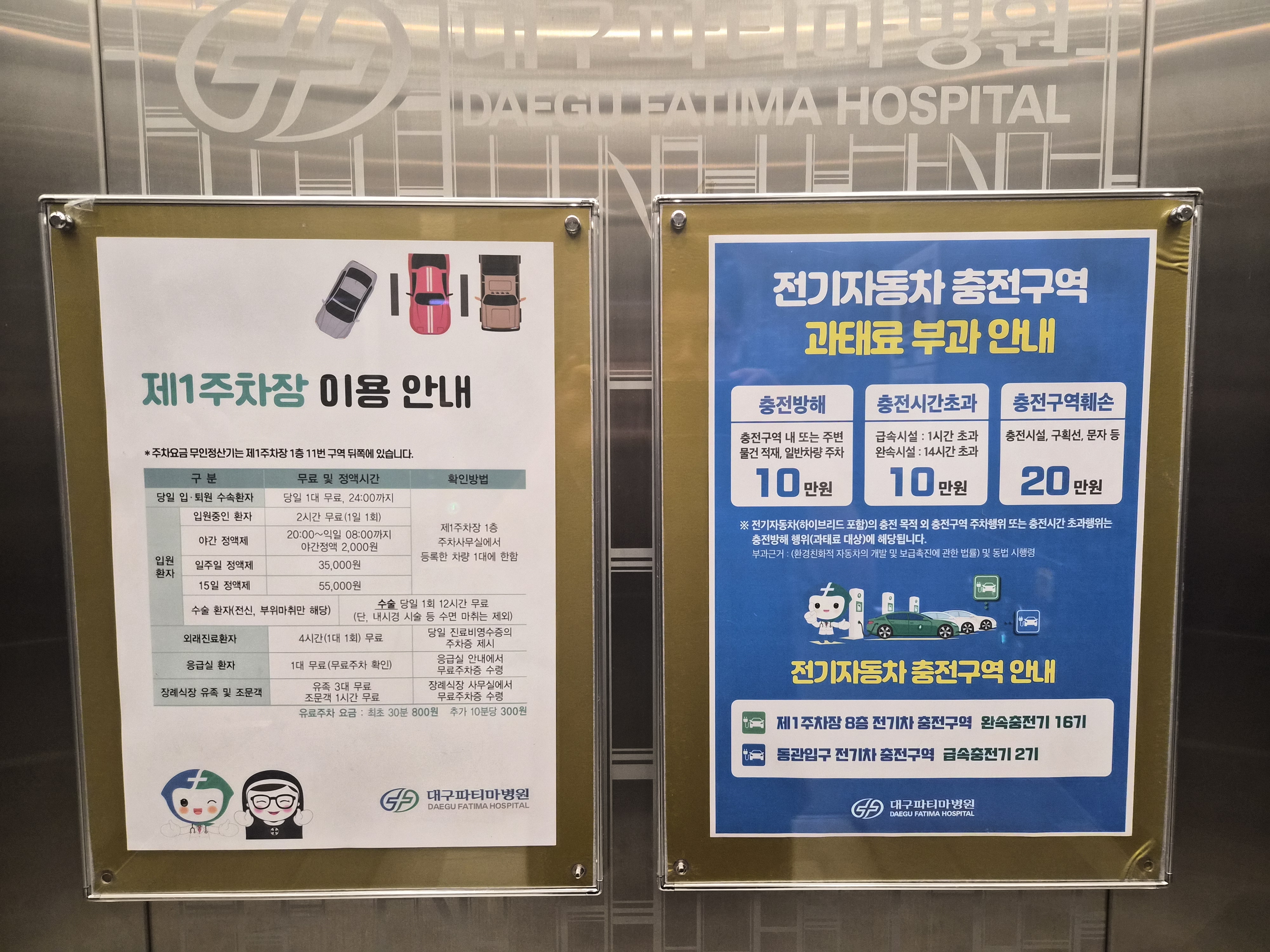 대구 파티마병원 주차장에 주차를 하면 된다. 장례식장과 함께 운영되는 종합병원이기 때문에 주차장이 의외로 꽤 규모가 있긴 한데 2층~3층 등으로 올라가고 또 내려가는 코너링 골목은 좀 좁은 편이고 주차공간도 다소 좁아서 운전 실력은 어느정도 요구되는 것 같았다. 초보운전자분들은 좀 힘들지도...