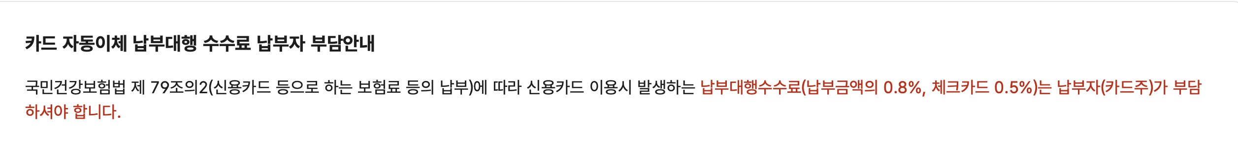 나는 국세 납부든 건강보험료 같은 공과금 납부든 반복적으로 발생하는 거의 모든 납부를 신용카드 납부가 아니라 계좌이체로만 납부한다. 그렇게 하는 이유는 신용카드 납부의 경우 수수료가 붙기 때문이다. 수수료는 0.5%~0.8% 수준으로 수수료 자체가 엄청 높은건 아니지만, 반복 결제 된다는점 + 수십년 이상 장기적으로 내야한다는점을 고려할 때 이러한 수수료가 최종적으로 금액을 많이 깎아먹는다고 생각해서 계좌이체로만 처리하고 있다.