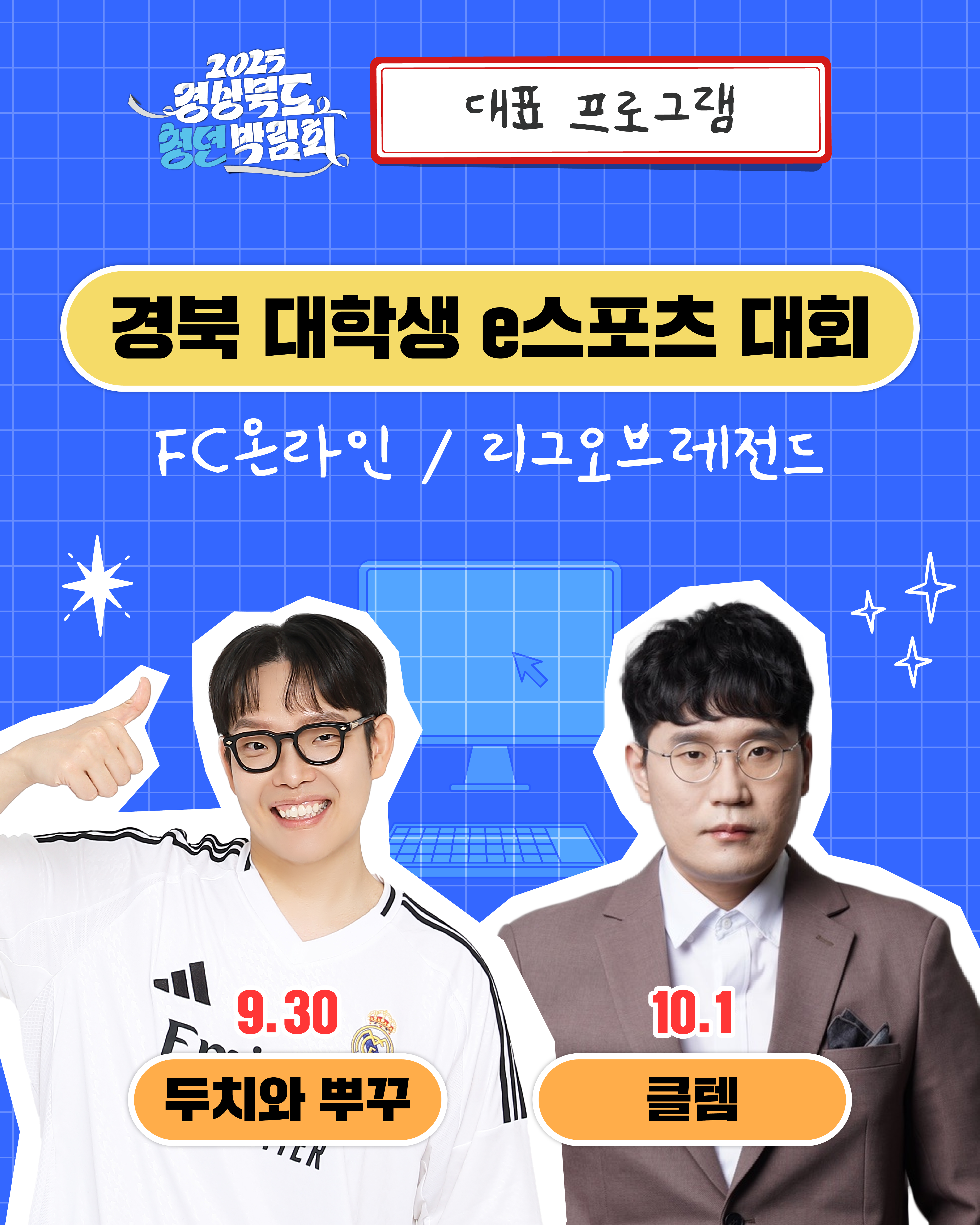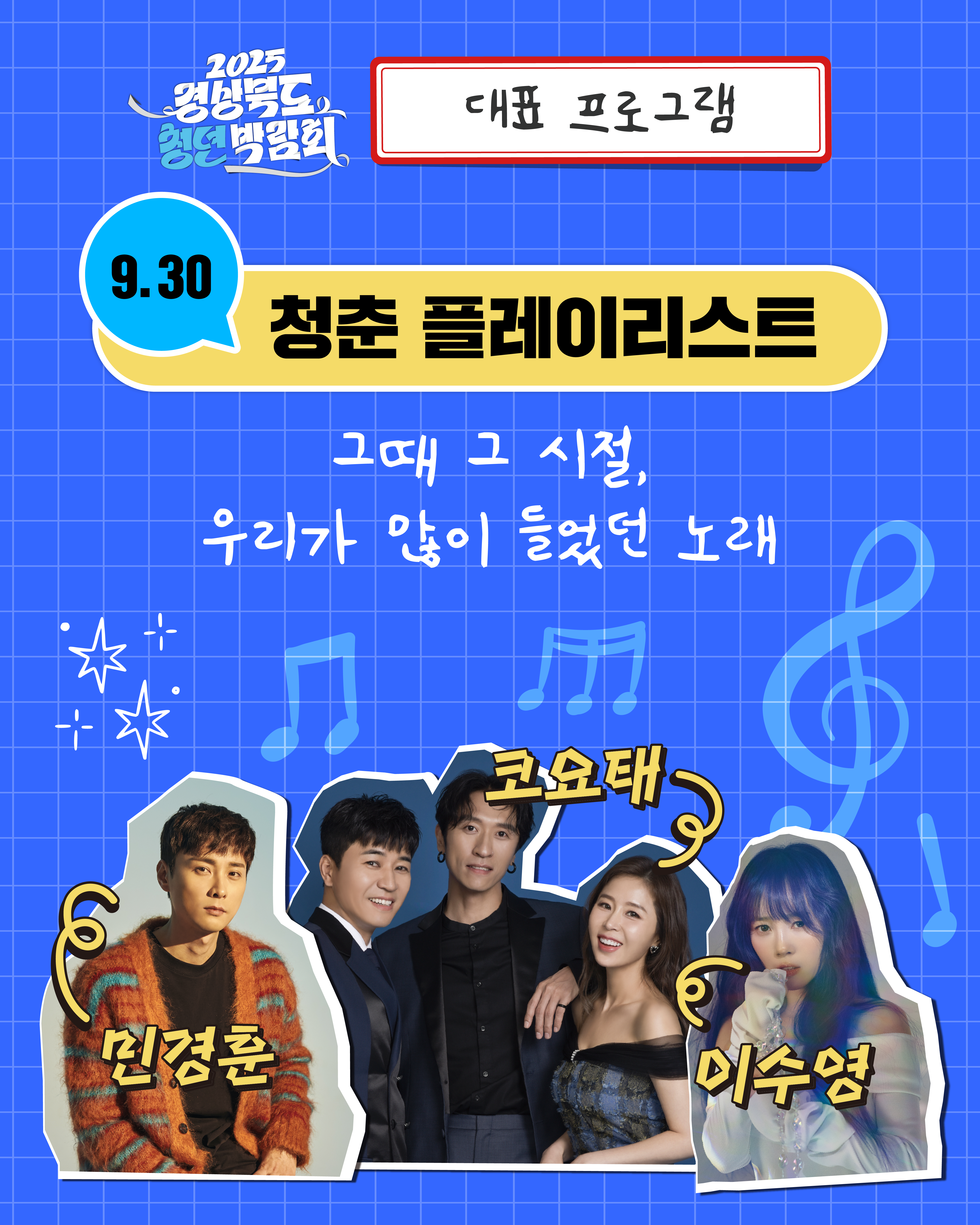 9월 30일에는 또 경북 대학생 e스포츠 대회로 FC온라인과 리그오브레전드가 예정돼 있습니다. 더불어서 청춘 플레이리스트라고해서 민경훈, 코요태, 이수영 공연도 열립니다.