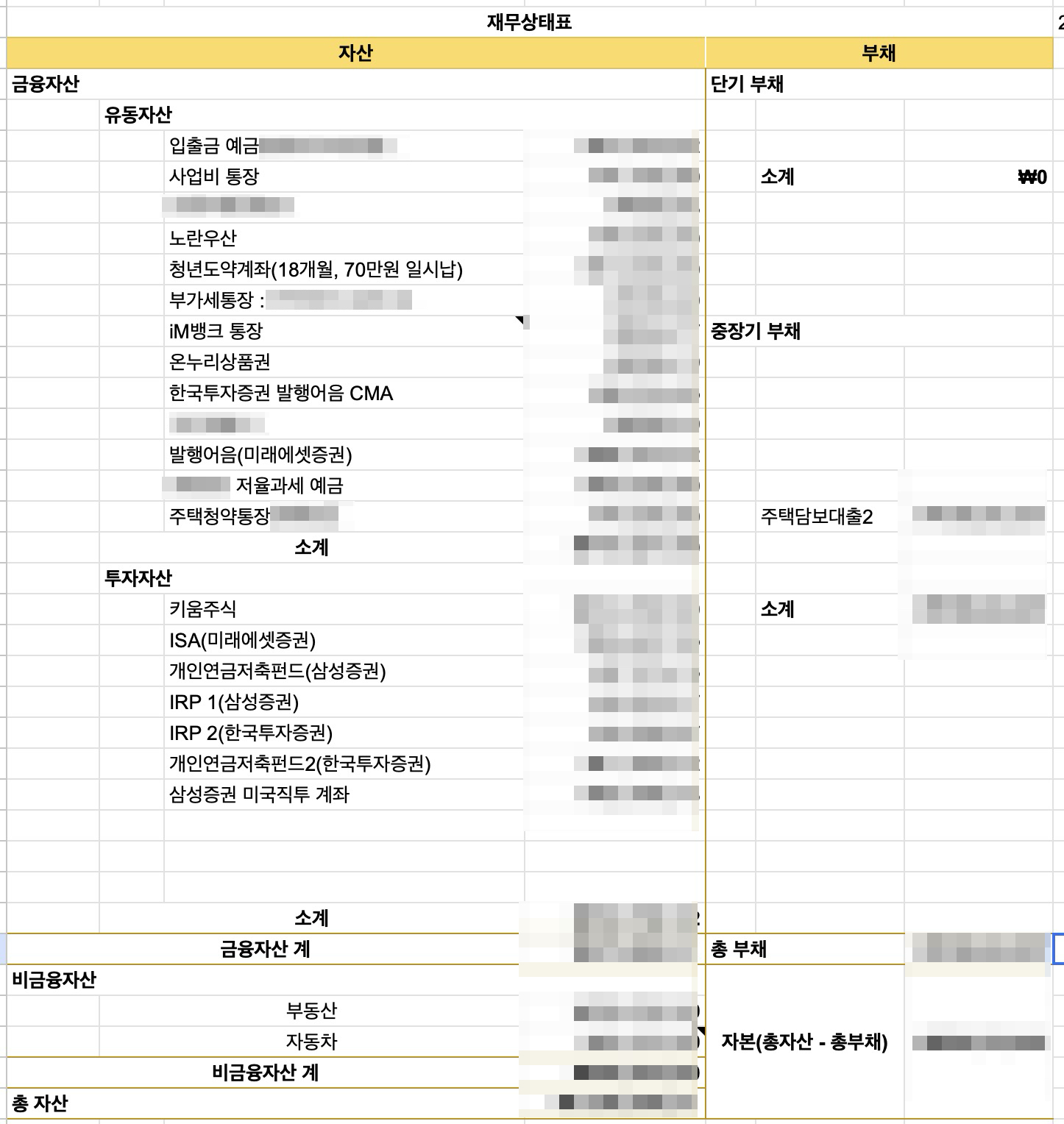 2025년 버전으로 오게되면 재무상태표 항목이 많이 늘어나게 된다. 기존에 있던 항목이 없어지기도 하고 새로운 항목이 추가되기도 한다. 돈을 여기저기에 나눠놓고, 여기저기에 투자해야하는 장기투자자 특성상 이러한 재무상태표 작성은 필수적이라고 생각하고 있다. 주식도 마찬가지.
