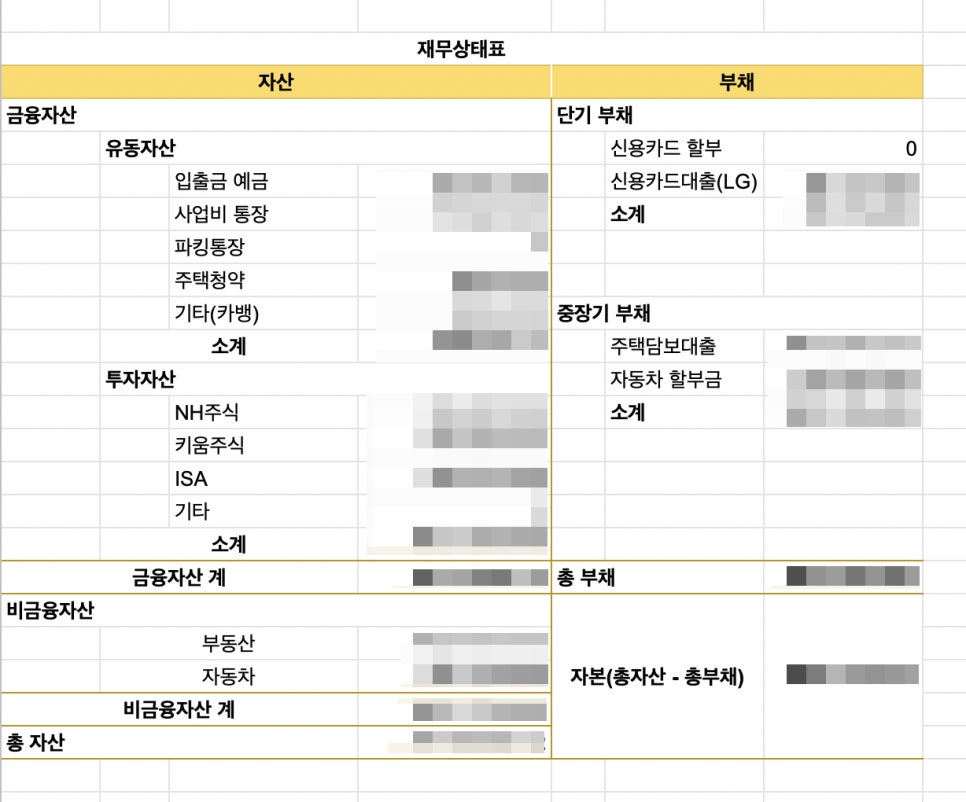 2021년에 적었었던 가계 재무상태표 스크린샷이다. 왼쪽에 금융자산과 비금융자산으로 구분해서 입력하고 오른쪽 상단에 부채를, 오른쪽 아래에는 자본을 넣어서 실질적으로 순자산이 얼마인지 알 수 있도록 만들면 된다. 수식도 더하기 빼기 밖에 없기 때문에 누구나 만들 수 있고 엑셀 몰라도 만들 수 있다. 최소한 sum 함수만 알아도 되며, 함수 몰라도 요즘에는 자동 추천이나 합계를 아래에 표시해주는 기능 같은게 많아서 쉽게 만들어서 관리할 수 있다.