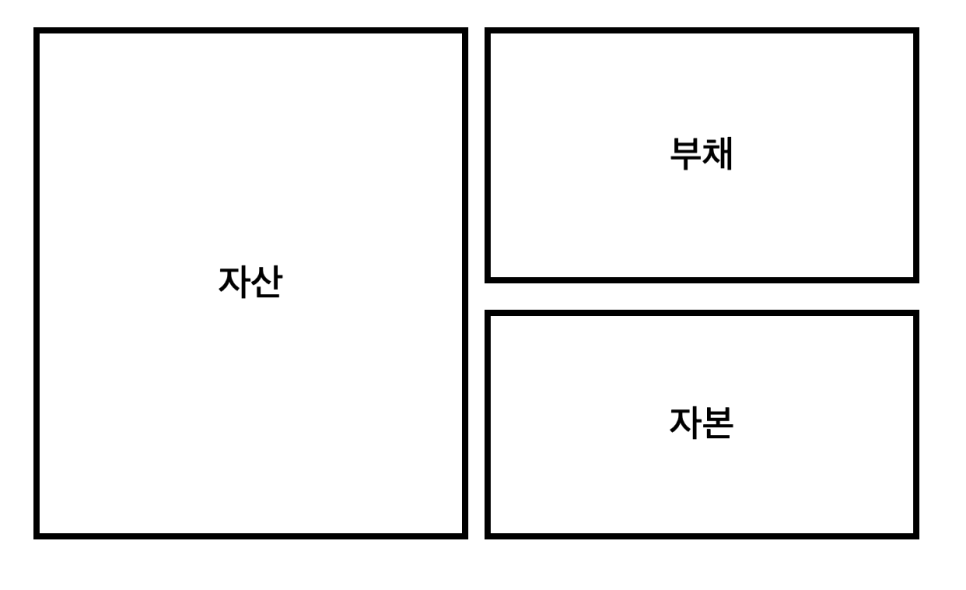 왼쪽에는 자산을, 오른쪽에는 부채를 적고, 오른쪽 하단에는 자본을 계산해서 넣으면 끝이다.