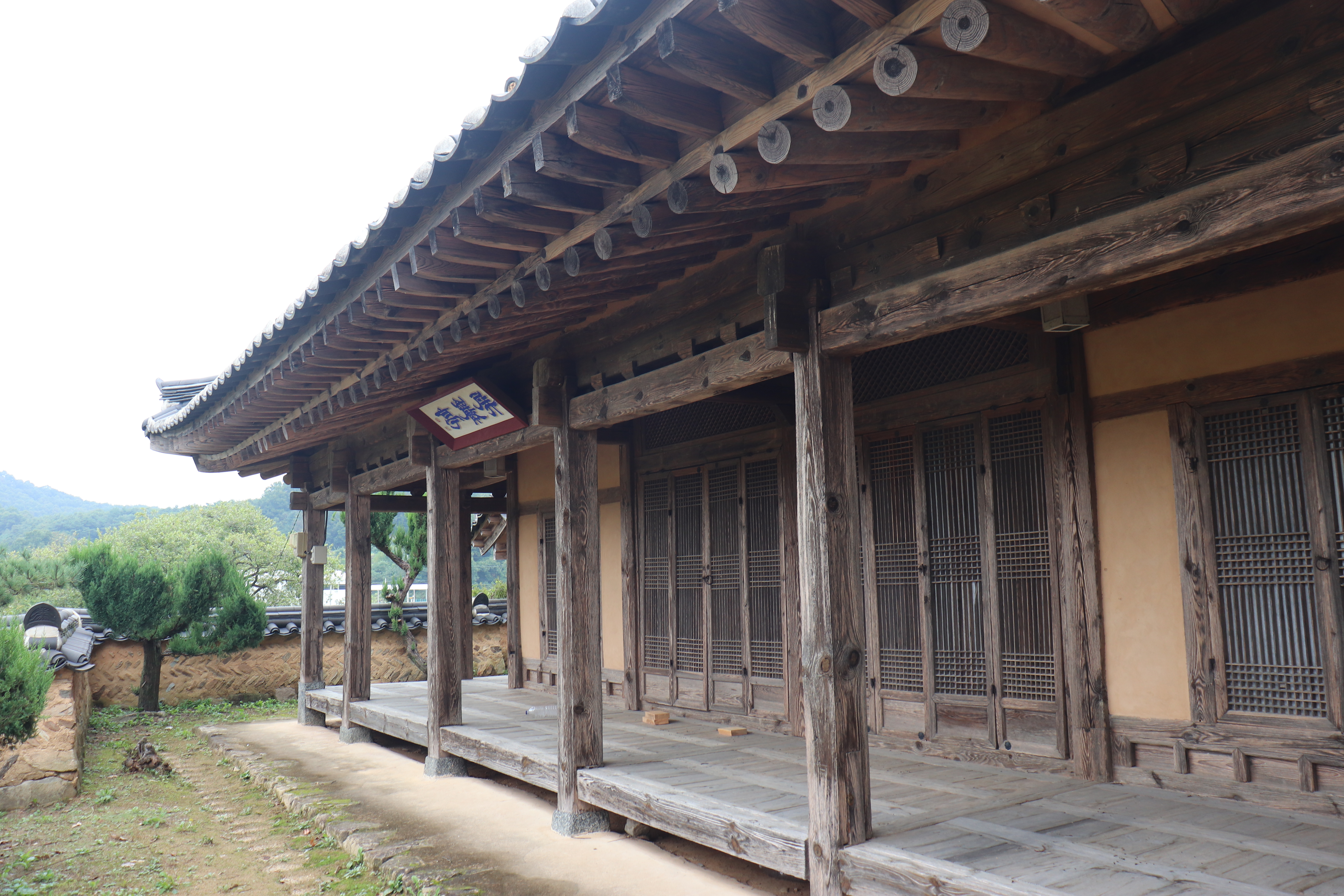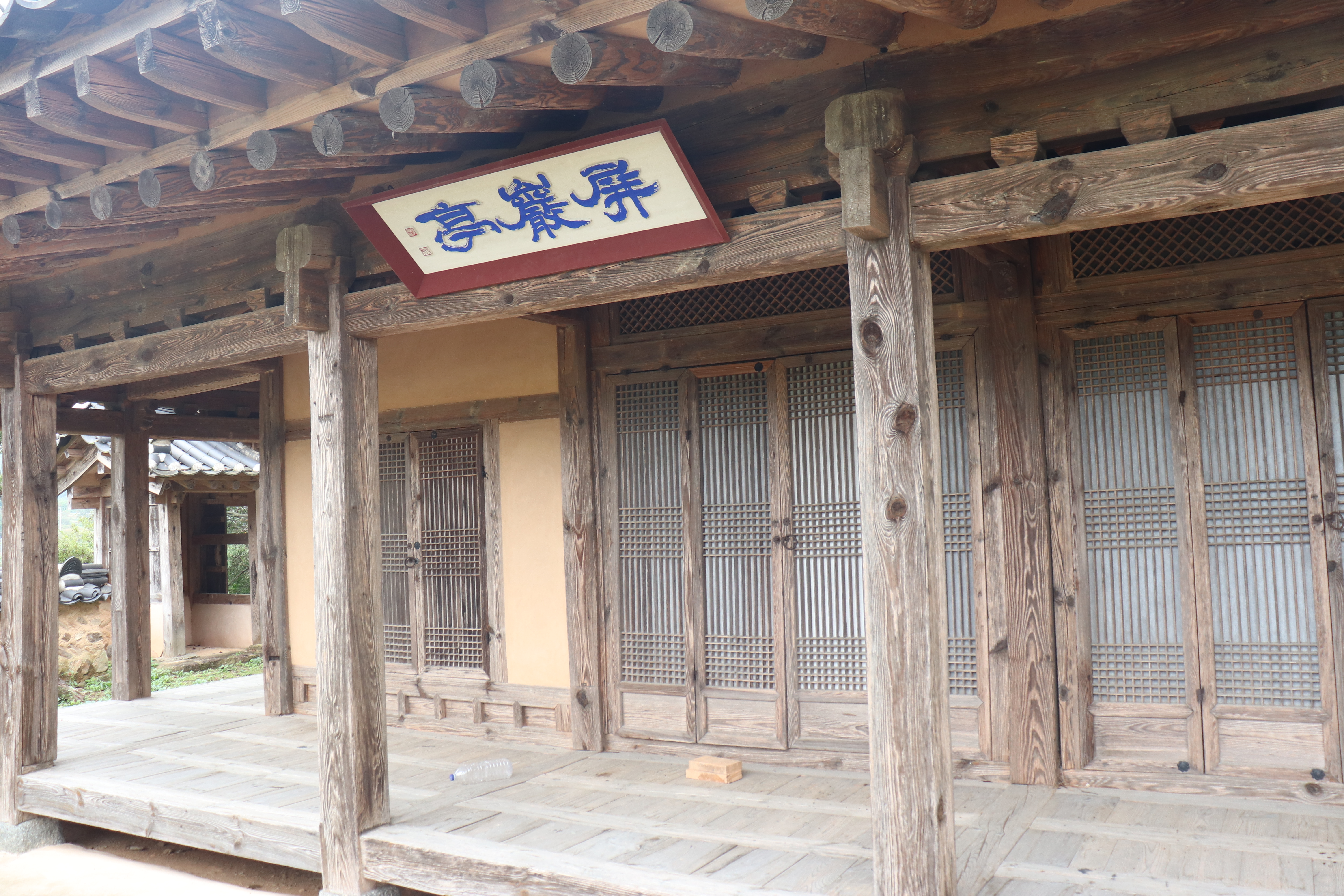 특히 마루에 앉아 밖을 바라보는 순간이 참 좋았어요. 정자 사방이 트여 있어서 어느 곳에 앉든 다른 풍경을 감상할 수 있거든요. 비 오는 날이라 더욱 고요했고, 빗소리와 나뭇잎 스치는 소리가 참 힐링되는 순간이더라고요. 정자 내부에는 현판도 걸려 있는데, 세월의 흔적이 고스란히 느껴지는 필체와 먹빛이 인상적이었어요. 옛 선비들이 이곳에서 시를 짓고, 학문을 논하고, 자연과 교감하며 살았을 모습을 상상해보았습니다.