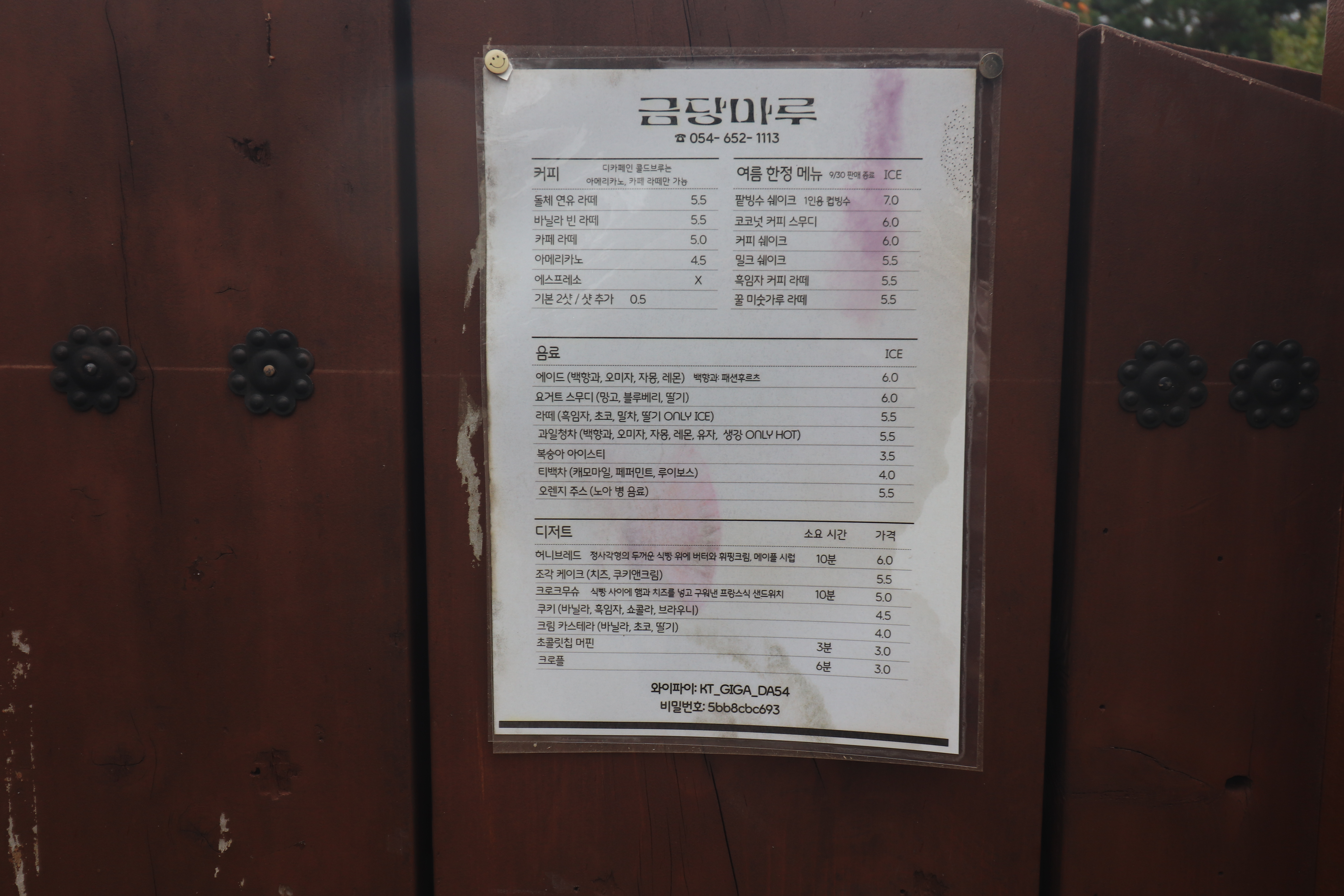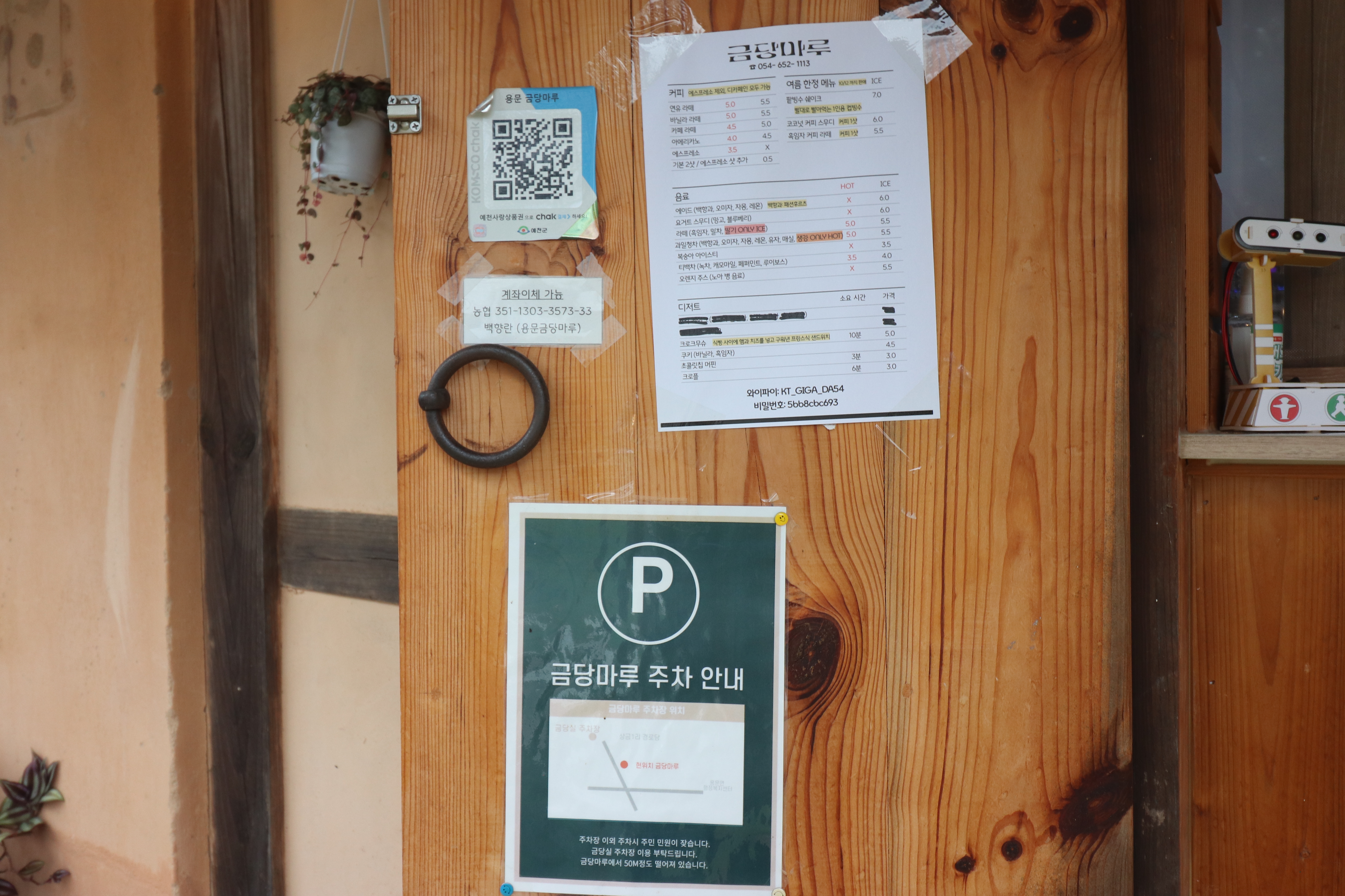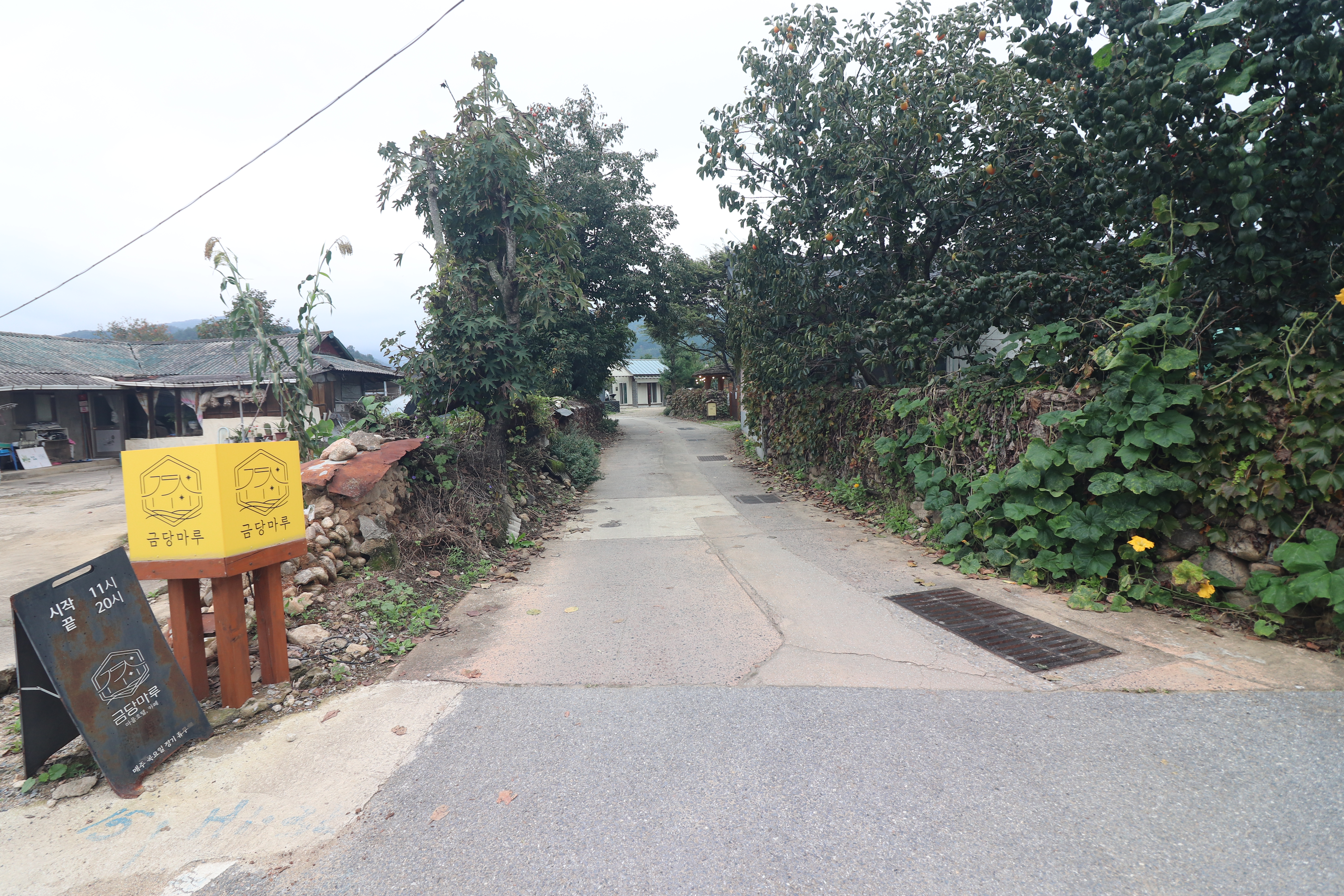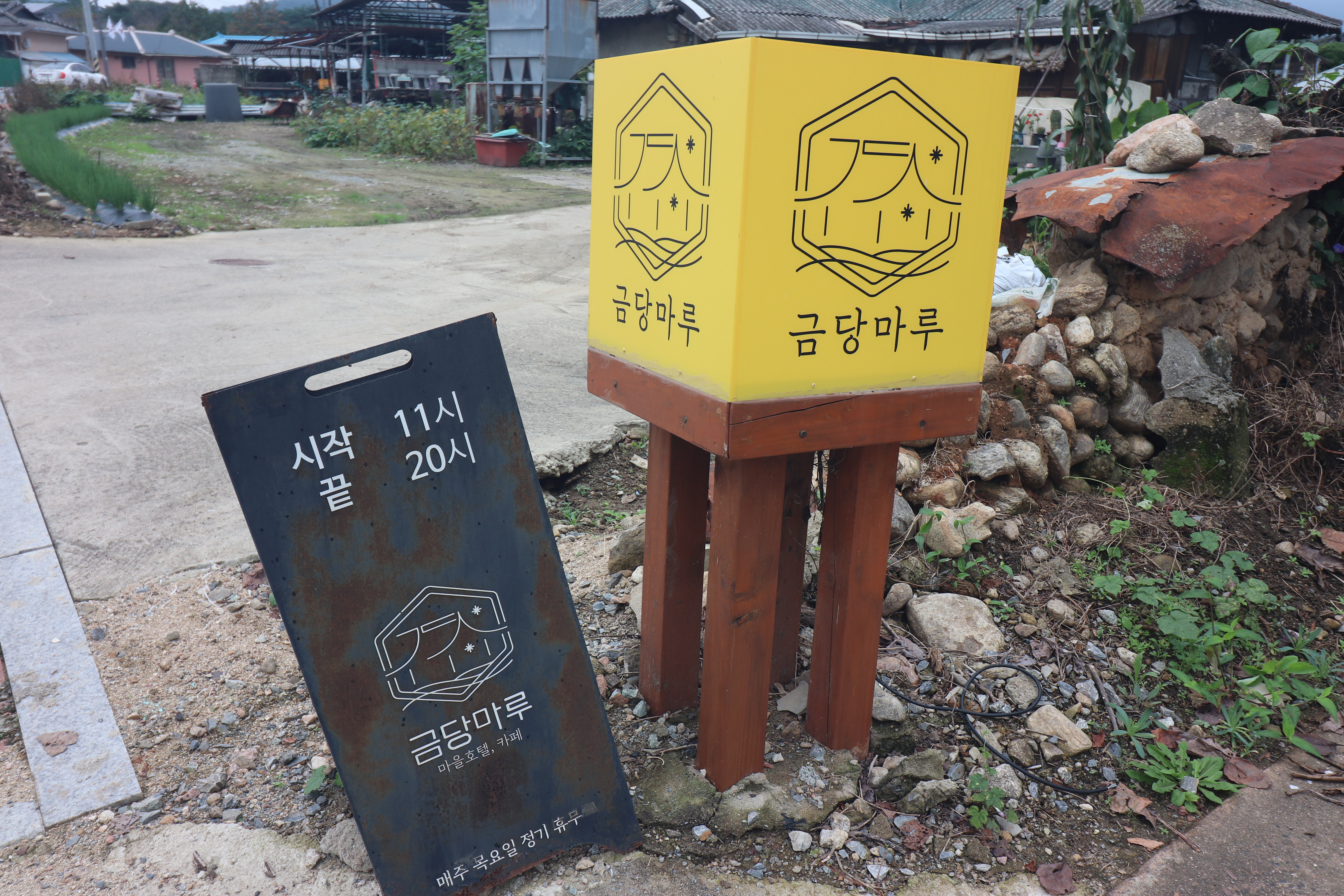금당실 마을 옆쪽에 있는 입구 쪽에서 금당마루 카페의 간판을 볼 수 있습니다. 오전 11시에 오픈하고 20시에 문을 닫는 카페이며 매주 목요일은 휴일입니다.