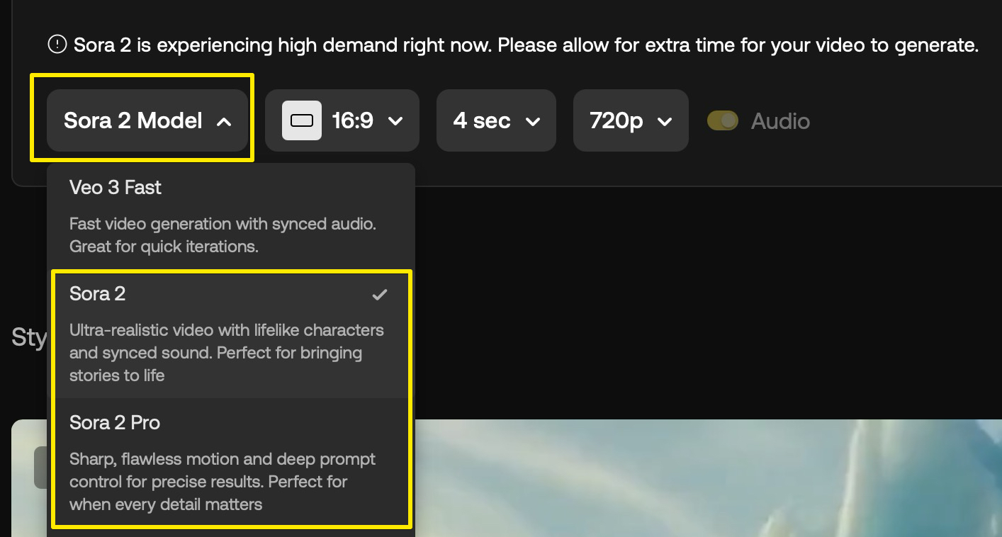 • Sora 2 Pro: 완벽한 움직임, 정확한 프롬프트 이해, 그리고 최상의 결과물이 필요할 때 모든 디테일을 만족시켜 줄 모델입니다.