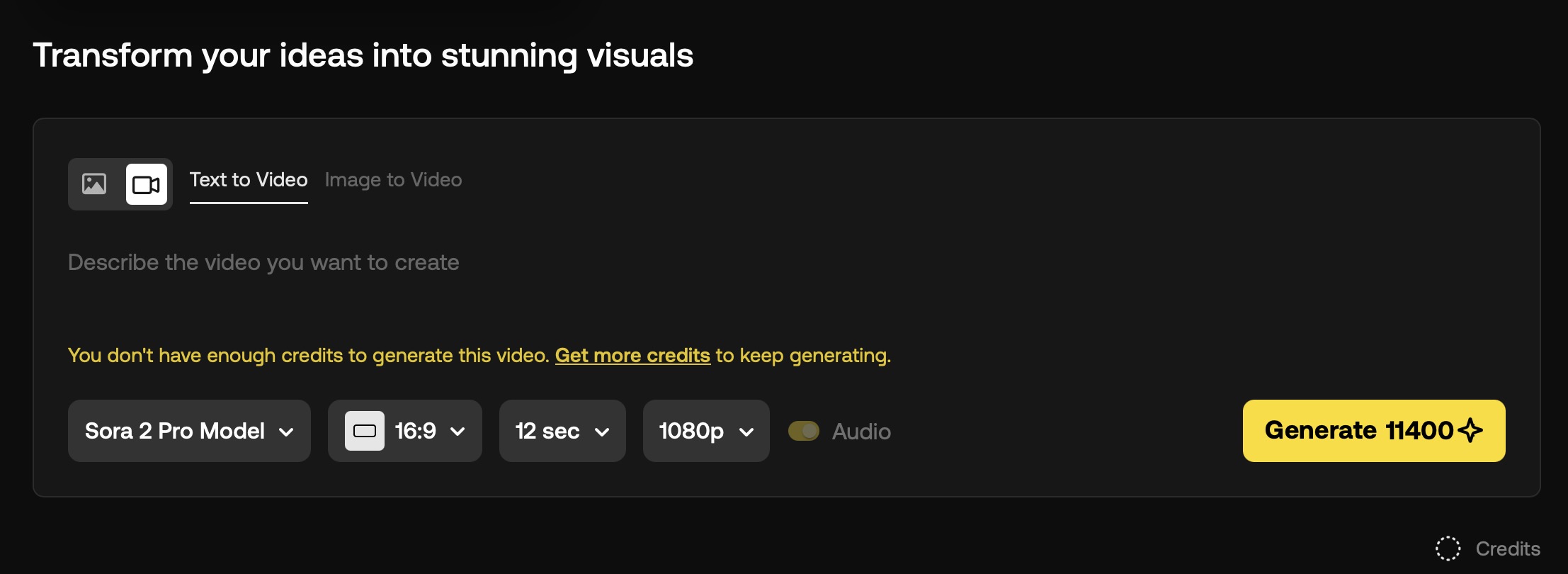 Sora 2 Pro 모델을 사용하면 12초짜리 영상을 1080p로 생성할 수 있습니다. 이때에는 크레딧이 11,400개 소모되어서 크레딧 소모가 꽤 많은 편입니다.