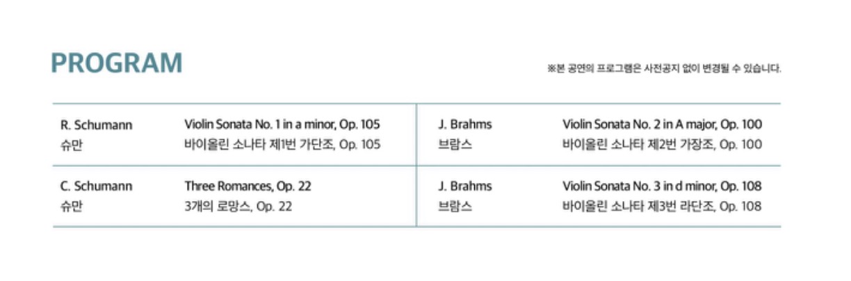 이번 공연은 낭만주의 시대의 대표 작곡가인 슈만과 브람스의 곡으로 채워졌습니다.