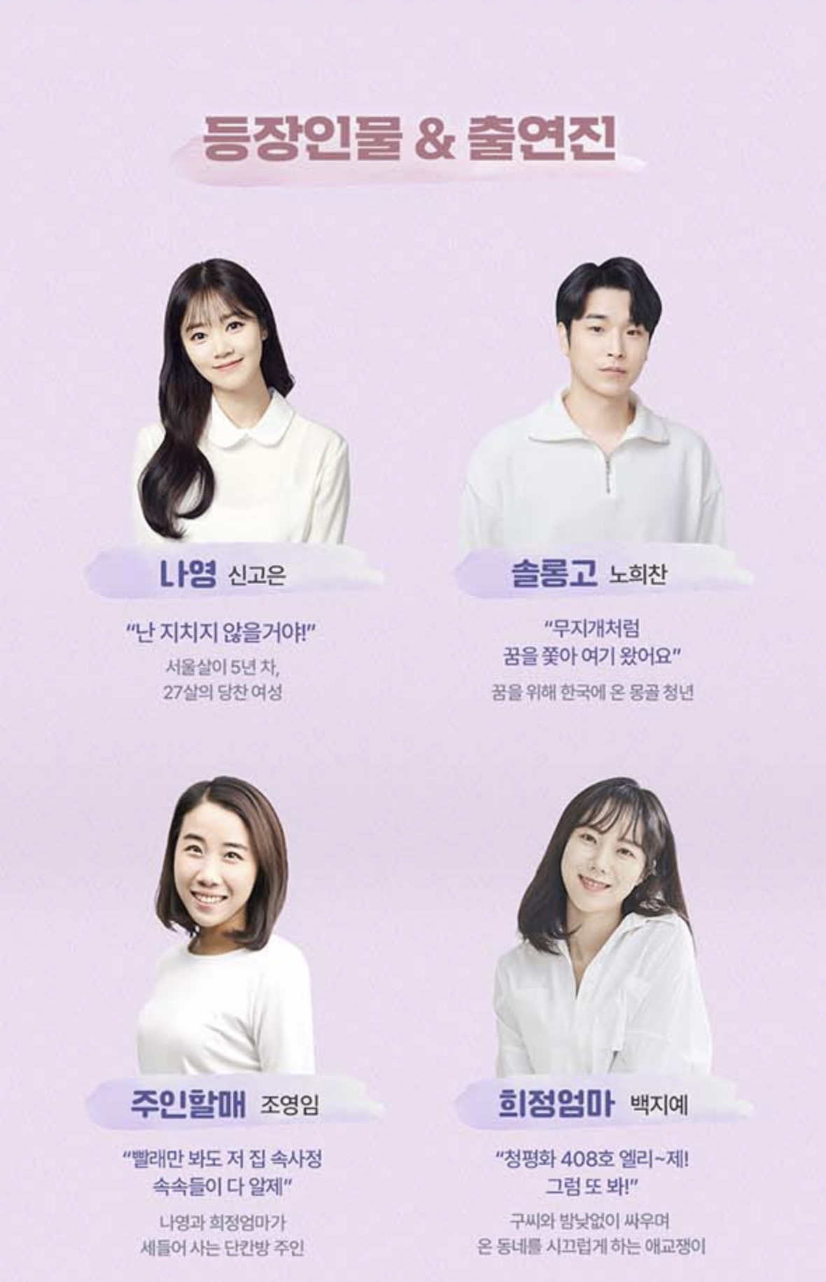 옥상에 널린 빨래가 바람에 흩날리는 모습처럼, 바람 잘 날 없는 우리네 인생을 따뜻한 시선으로 보듬어주는 이 작품은 '오늘을 살아가는 우리들의 이야기'입니다. 힘든 현실에 주저앉고 싶을 때, 주인공들이 건네는 "괜찮아, 너에겐 예쁜 미소가 있으니"라는 위로의 한마디는 아마 오랫동안 가슴에 남아 큰 힘이 되어줄 것 같은데요.
