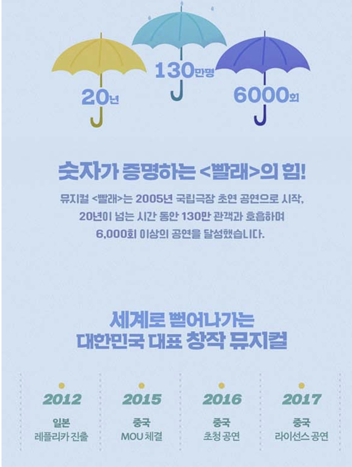 2005년 초연 이후 19년 동안 수많은 관객의 눈물과 웃음을 자아내며 대한민국 대표 창작 뮤지컬로 자리 잡은 <빨래>가 드디어 대구 수성아트피아를 찾아옵니다. "괜찮아, 힘을 내!"라는 따뜻한 응원의 메시지와 함께 우리네 사는 이야기를 담아낸 뮤지컬 <빨래>, 그 감동의 무대를 수성아트피아에서 만나보세요.