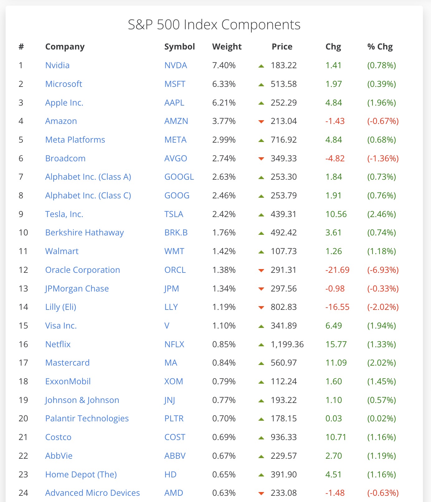 2025년 3분기 S&P 500 기업 목록을 보게되면, 엔비디아, 마이크로소프트, 애플, 아마존, 메타, 브로드컴, 알파벳(구글), 테슬라, 버크셔해서웨이, 월마트, 오라클, JP모건, 비자, 넷플릭스, 마스터카드, 엑손모빌, 존슨앤존슨, 코스트코 등 이름만 들으면 알만한 기업들이 총망라 되어 있다. 그리고 이런 기업들은 미국에서만 활동하는 기업들이라기보다는 전세계를 대상으로 사업을 펼치기 때문에 사실상 S&P 500 자체가 글로벌 전체에 투자하는 것이라고봐도 무방하다.
