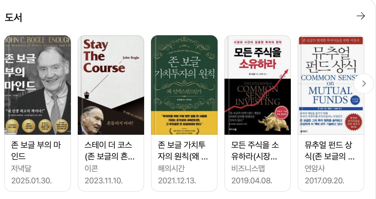 여기에 큰 역할을 한건 존보글의 책이었다. 나는 존보글의 책을 거의 모두 사서 읽어보았고 특정 책은 2번 이상 읽은적도 있다. 존 보글의 투자 철학과 뒷받침되는 근거들, 장기적으로 우상향하는 수익률과 평균 회귀, 심리적 평온함과 시간 활용 측면 등 거의 모든 요소에서 나에게 잘 맞는다고 생각했고, 실제로도 잘 맞았다.