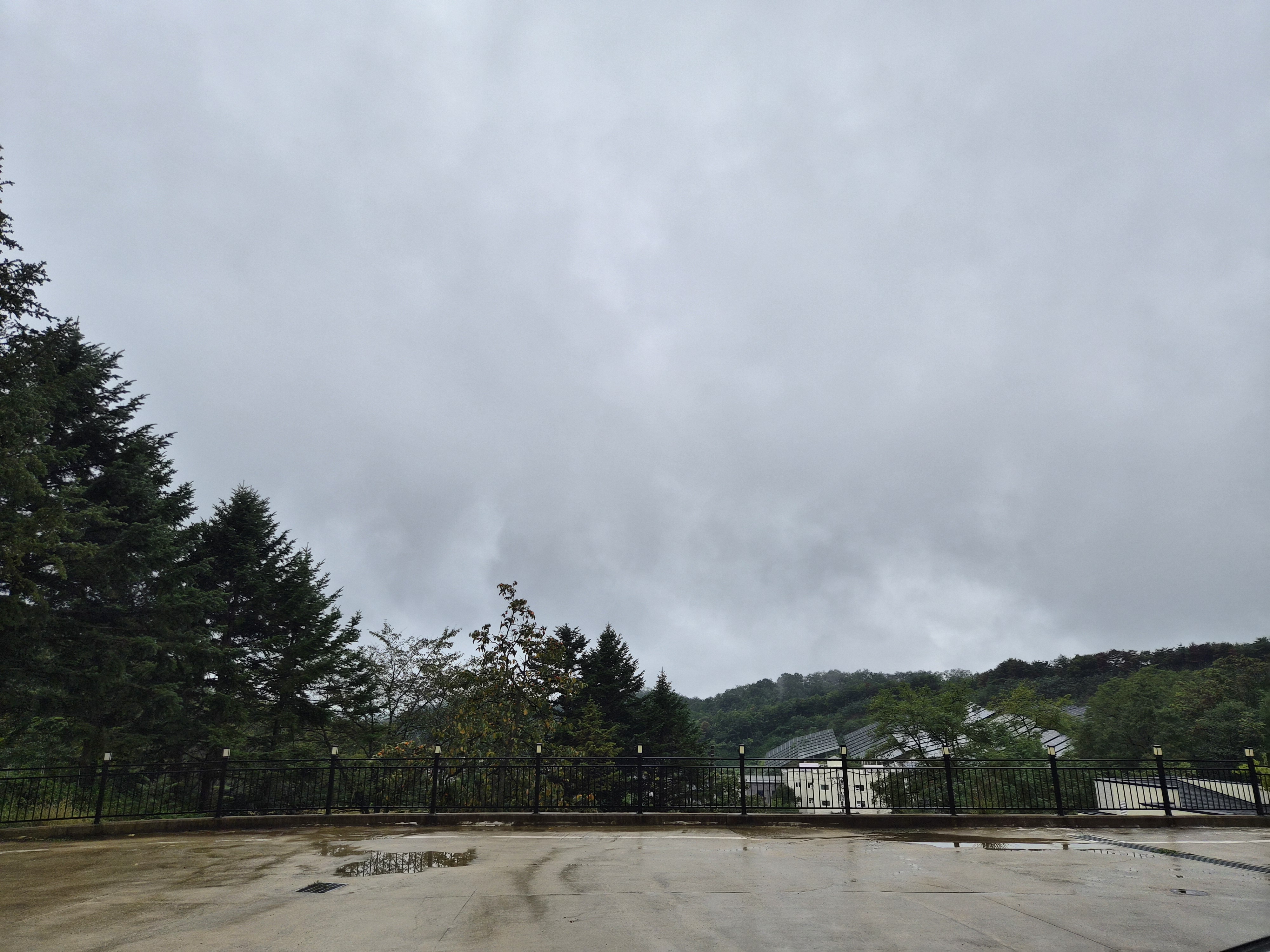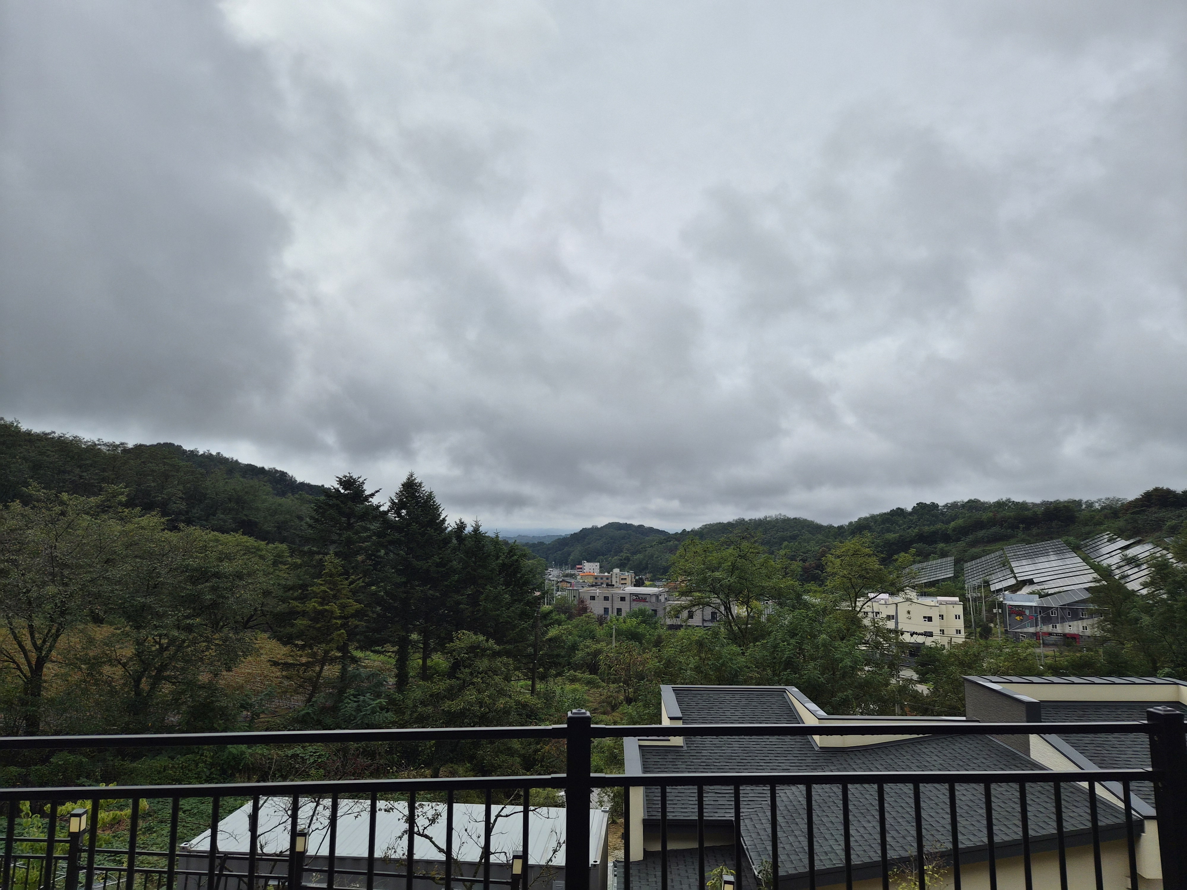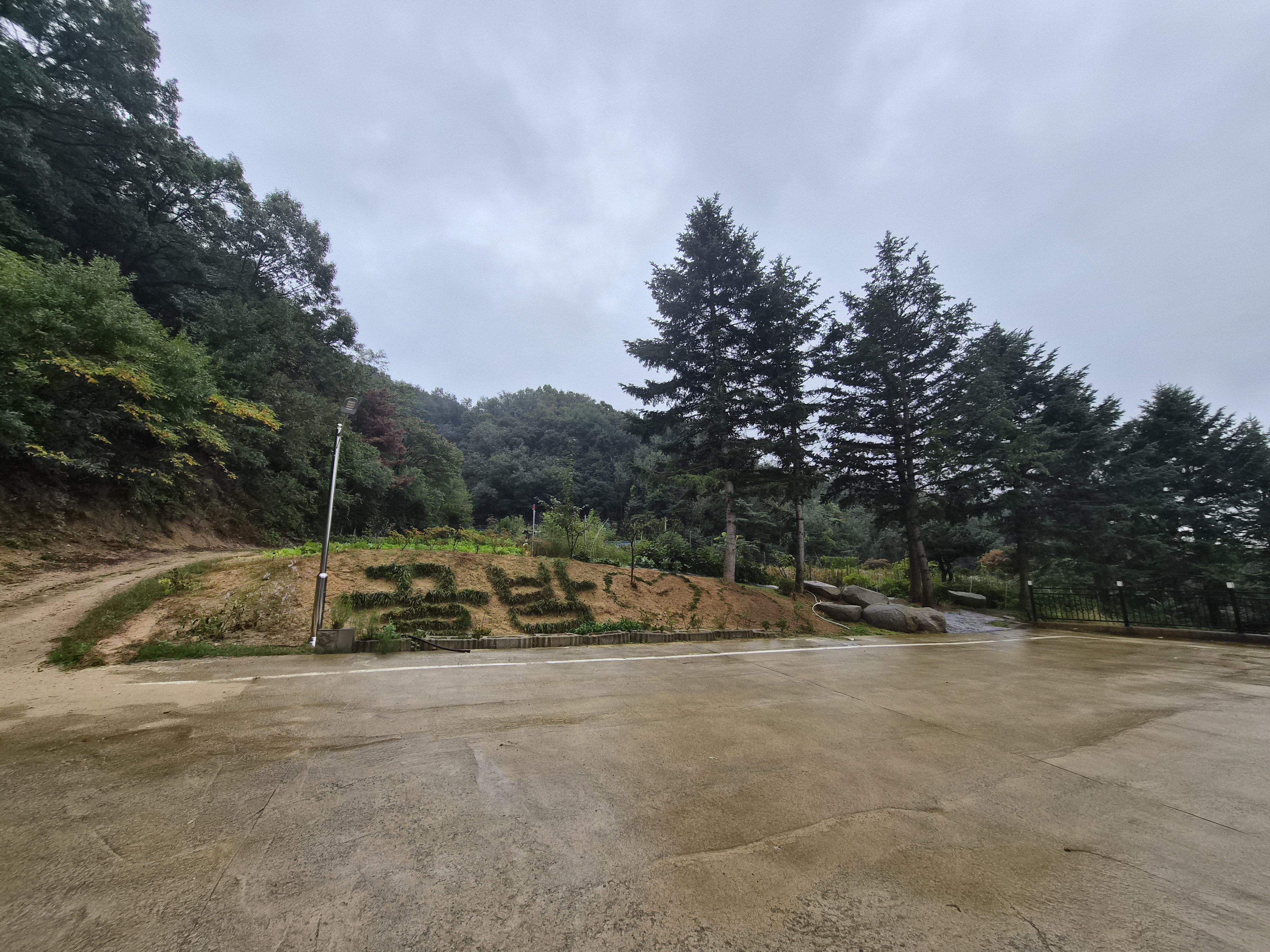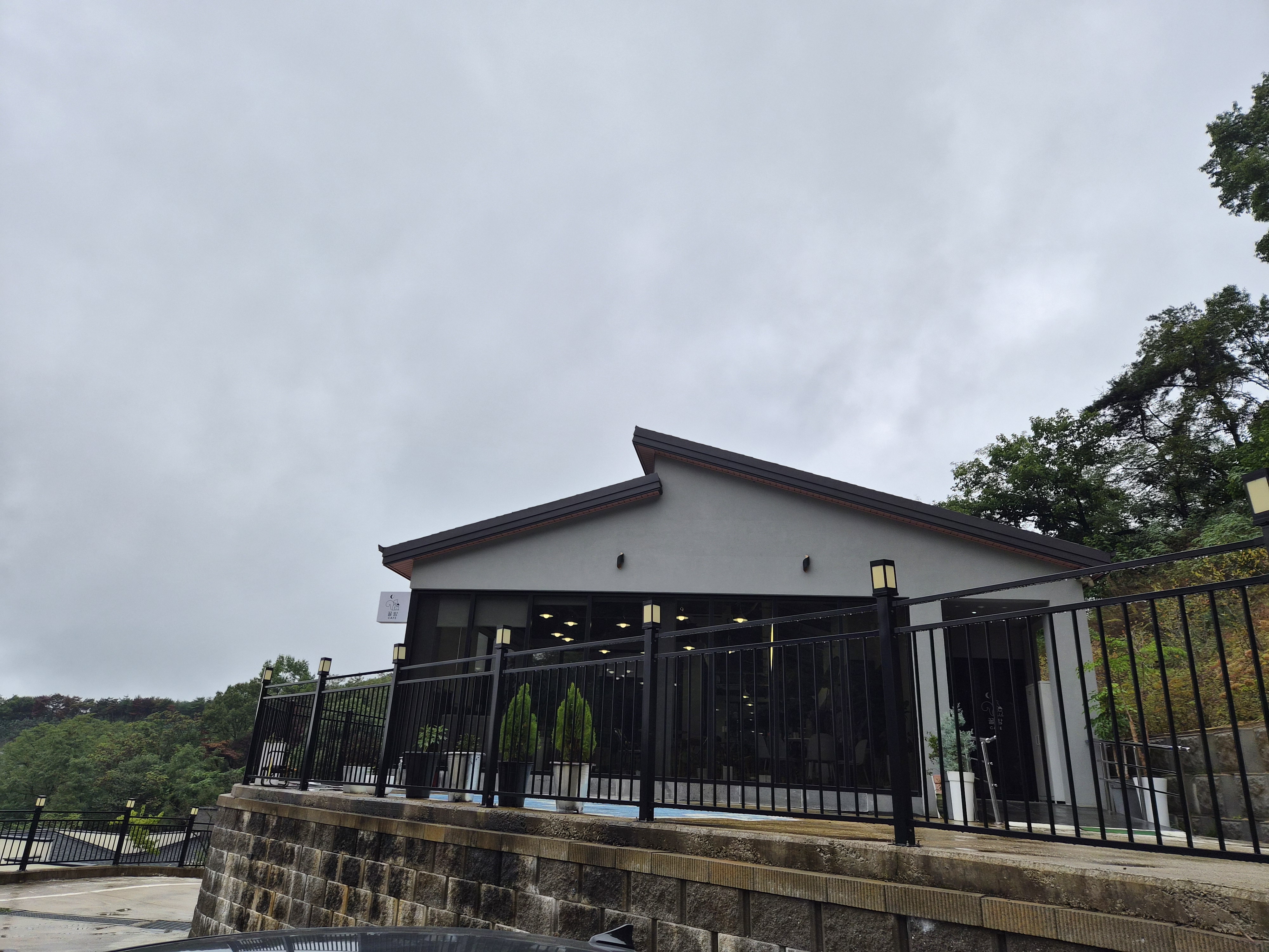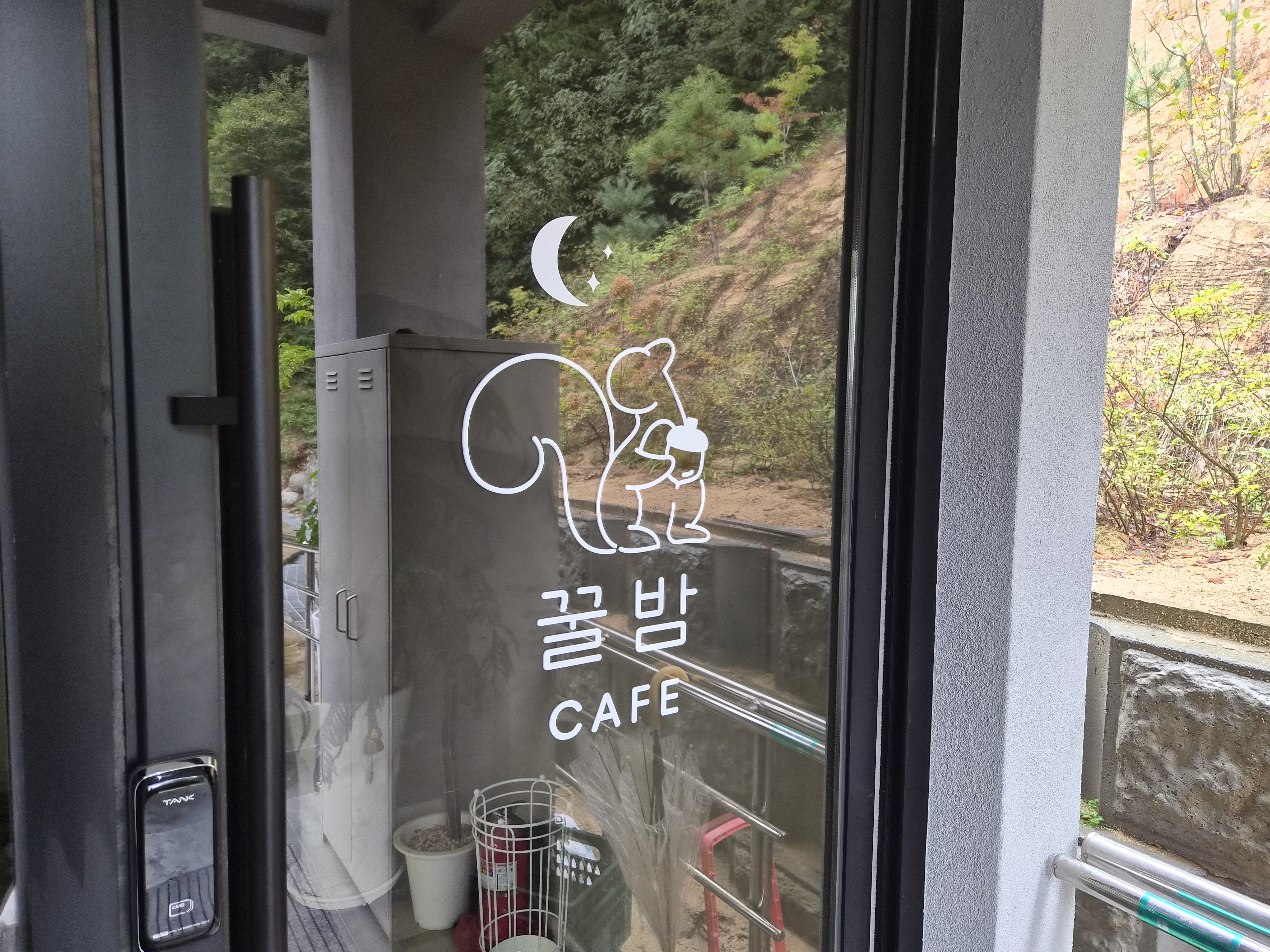 '꿀밤카페'는 월영교나 낙강물길공원에서 그리 멀지 않은 곳에 자리잡고 있습니다. 차를 타고 이동해야합니다. '동악골'이라고 불리는 이름의 깊숙한 산자락 끝에 자리하고 있었습니다. 굉장히 넓은 주차장을 보유하고 있고 주차장에서 보는 뷰도 참 멋졌어요. 이름이 '꿀밤'인 이유는 이 일대가 온통 도토리나무로 둘러싸여 있기 때문이라고 합니다. 경북 북부에서는 이 도토리를 '꿀밤'이라 부르는데, 그 정겨운 이름을 그대로 가져왔다고 합니다.