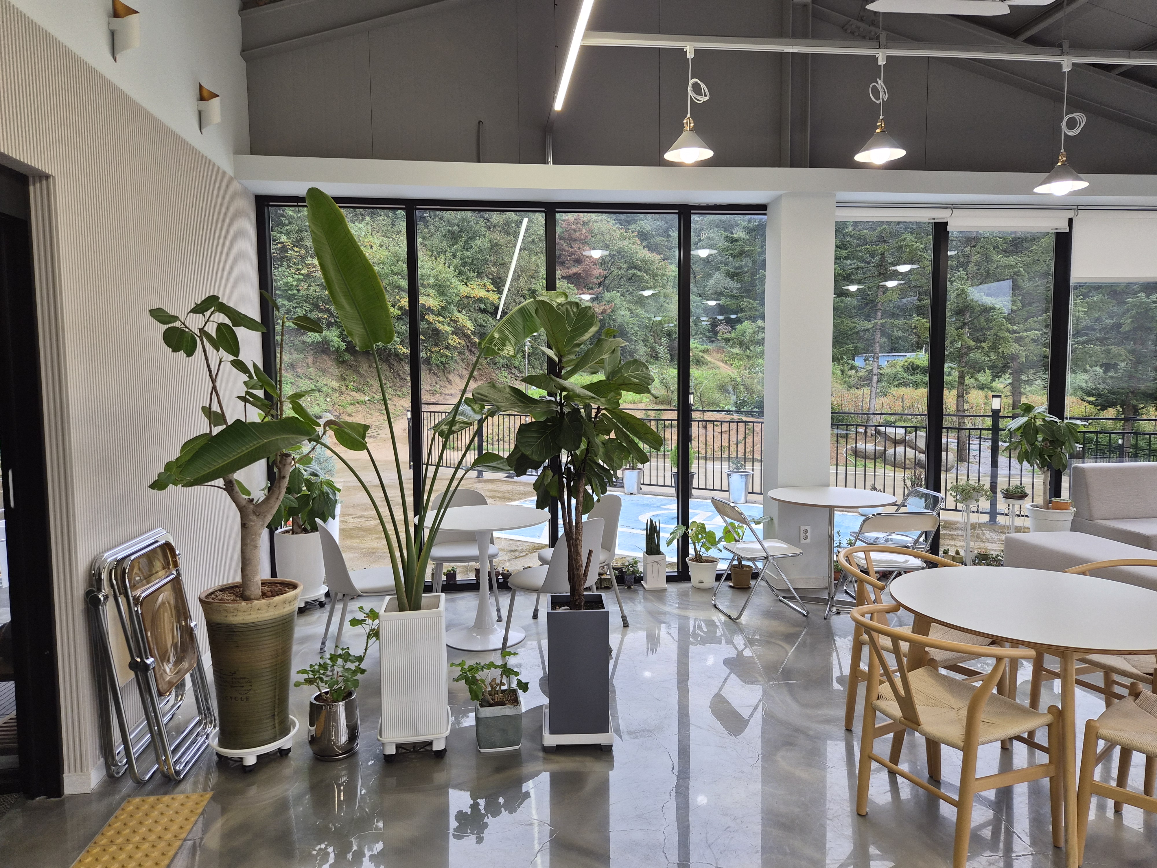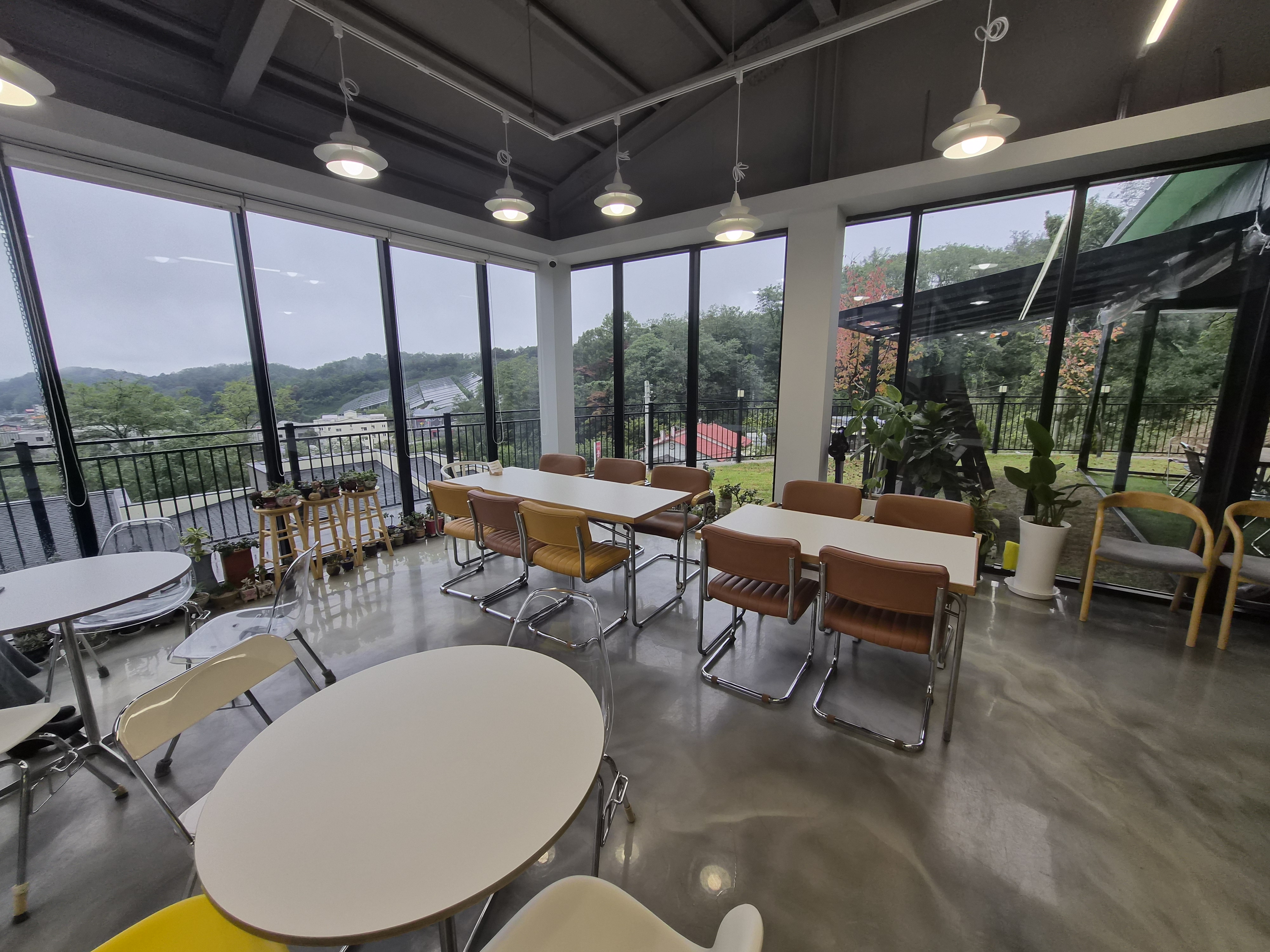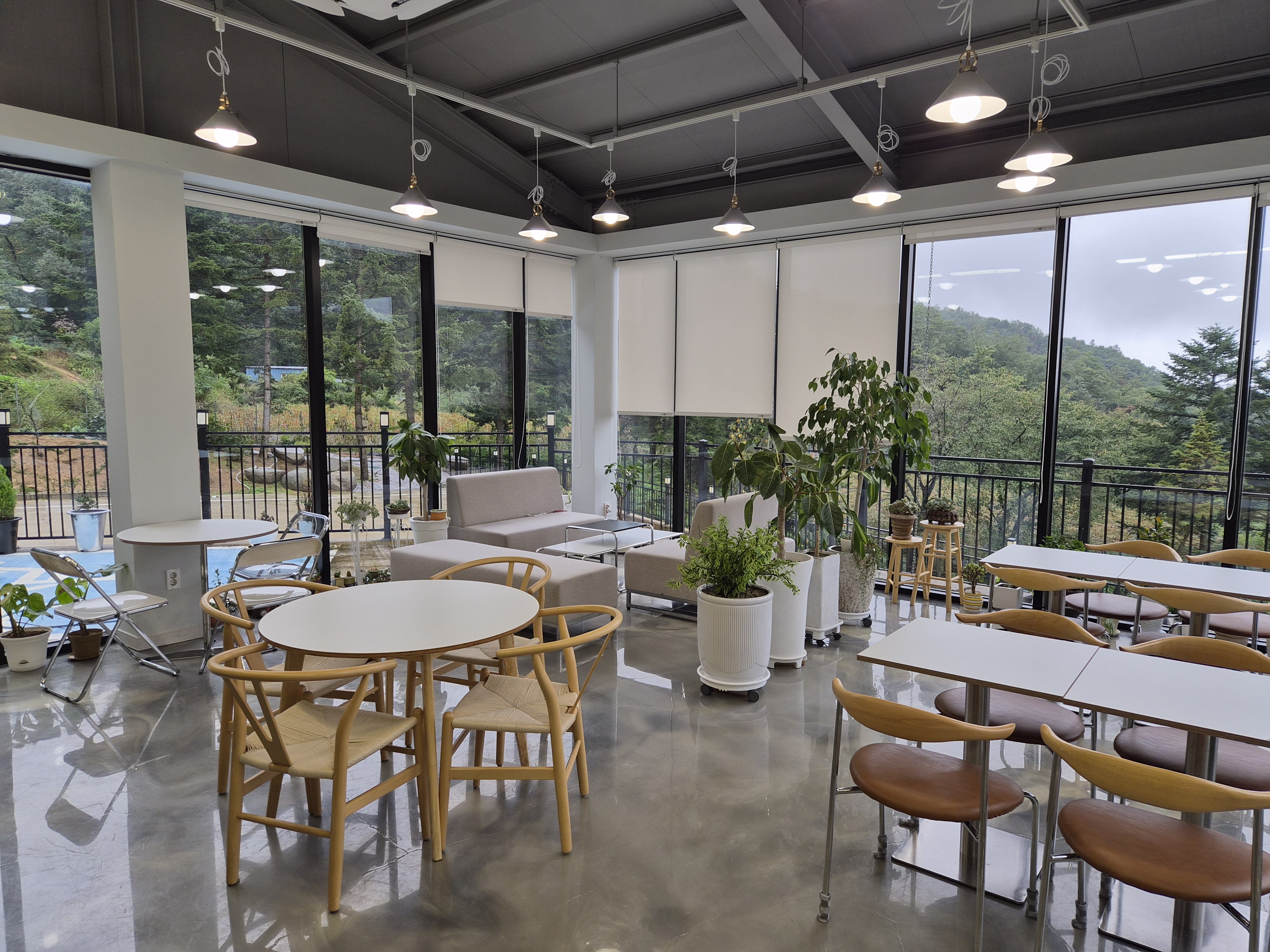 주문 후 카페를 잠깐 더 둘러보았어요. 야외공간도 멋지게 꾸며둔게 인상적이었는데요. 카페 중앙 부분에서는 폴딩 도어를 활짝 열어젖혀, 카페 안과 밖의 경계를 허문 개방감있는 곳도 인상깊었어요. 야외공간으로 이어지는 곳이었습니다. 시원한 산바람이 에어컨 바람을 대신해 실내를 가득 채우는 기분 좋은 공간이었습니다.